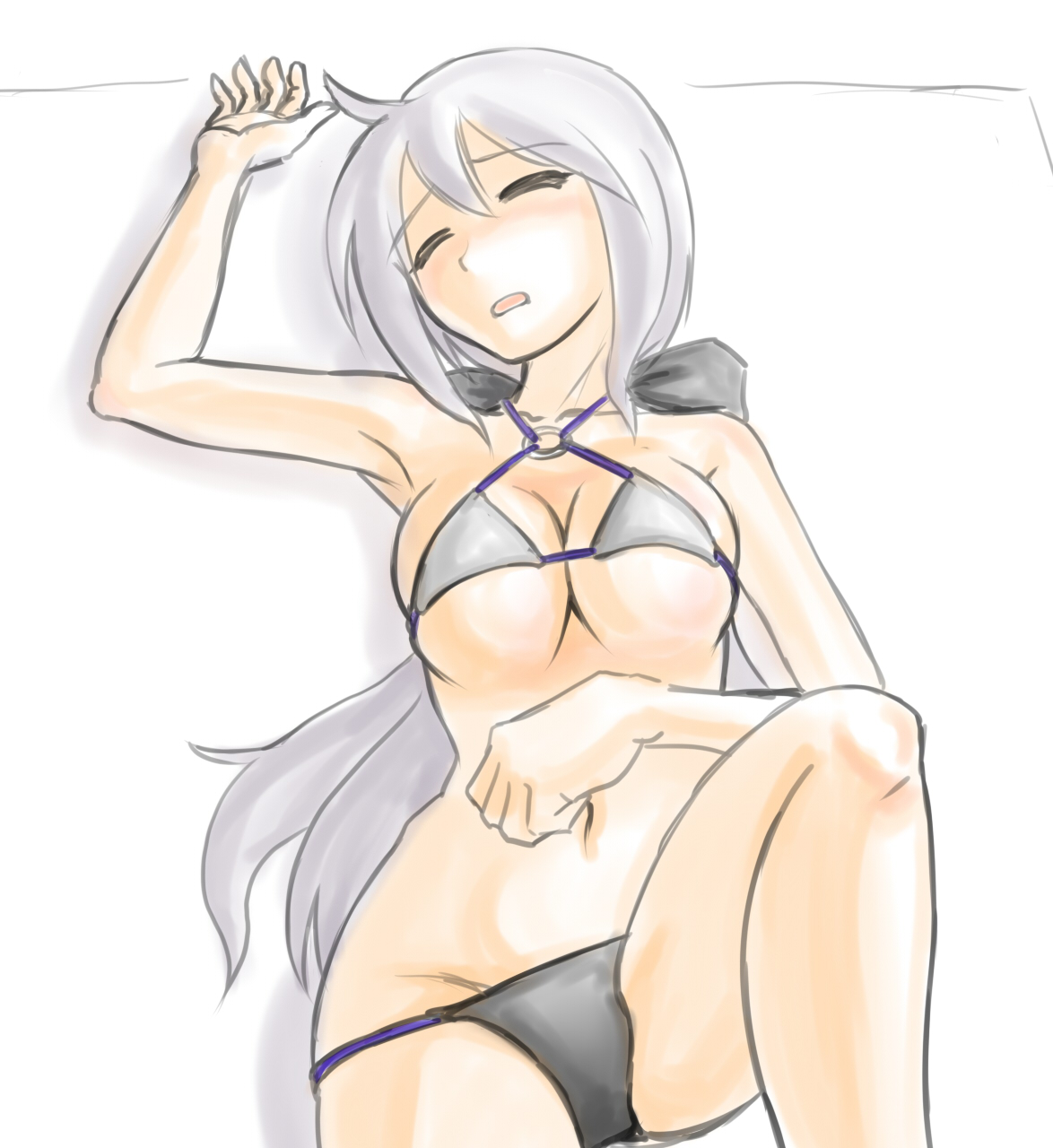 1girlahogebikinibreastscleavageclosed eyesfemale focushair ribbonlarge breastslong hairlyingon backponytailribbonsleepingsoloswimsuitunconsciousvery long hair