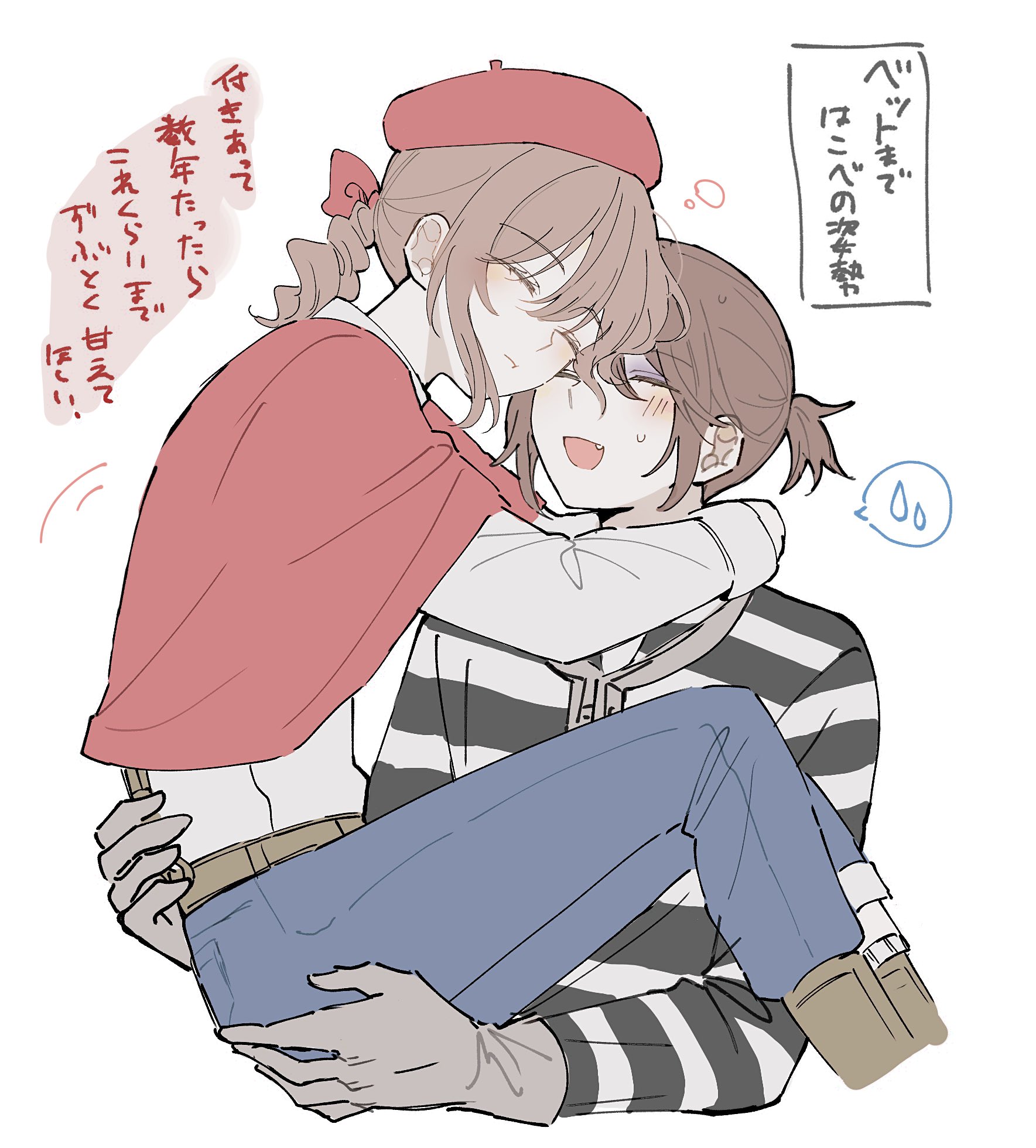 2boysandrogynousarms around neckberetblue pantsblushbootsbowbrown bootsbrown glovesbruisebruised eyecapeletcarryingcarrying personclosed eyesdrill hairdrill ponytailfangflying sweatdropsgloveshair bowhatinjurymale focusmultiple boyspantsponytailred bowred capeletshirtshort ponytailsmall sweatdropspoken flying sweatdropsstriped blushstriped clothesstriped shirtupper bodywhite shirtyaoi