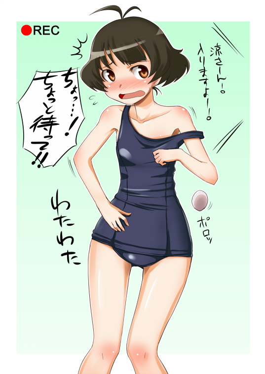 00s1boyantenna hairblushbreast paddingbrown eyesbrown haircrossdressingcrossdressing (mtf)male focusone-piece swimsuitrecordingschool swimsuitsolostrap slipsweatdropswimsuittraptremblingviewfinder