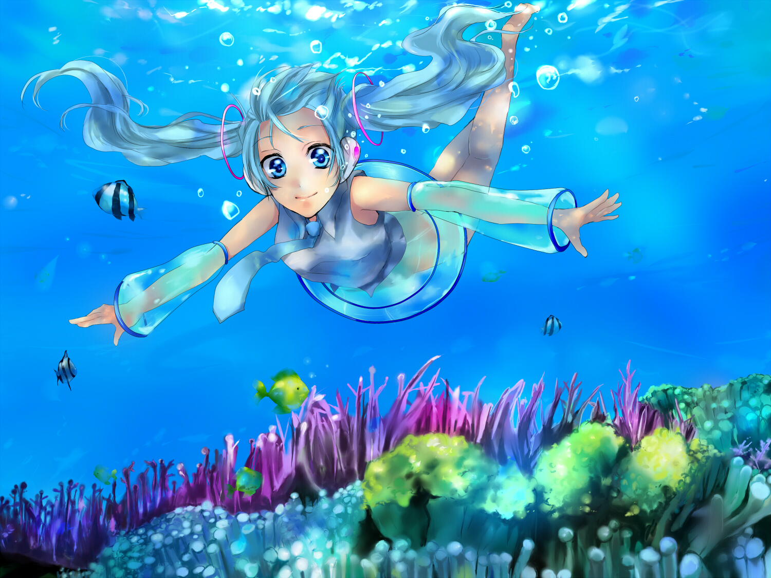 usugiri bacon, hatsune miku, vocaloid, bad id, bad pixiv id, translated, 1girl, aqua eyes, aqua hair, detached sleeves, female focus, long hair, necktie, skirt, solo, thighhighs, twintails, very long hair