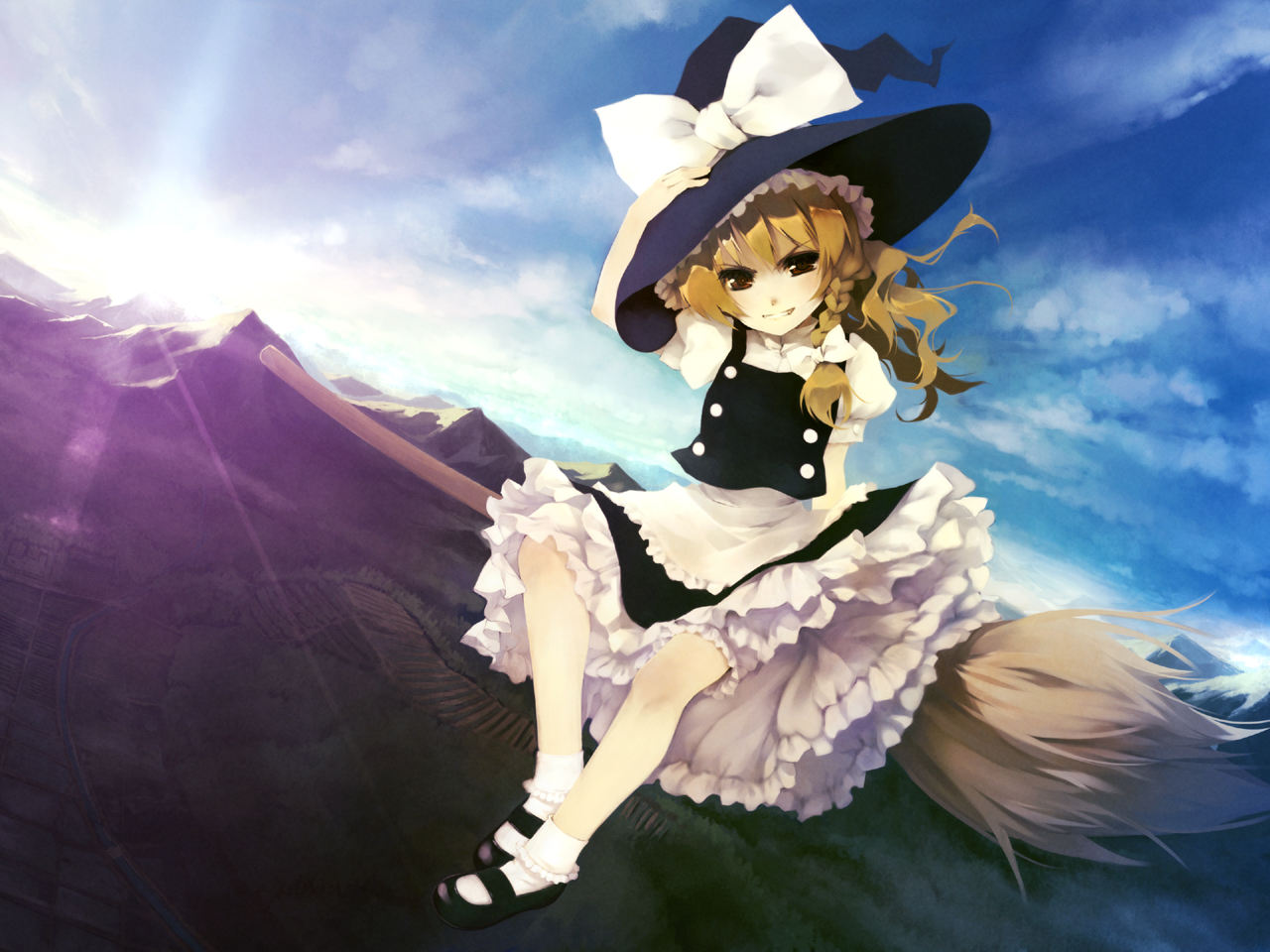 1girlblonde hairbraidbroombroom ridingclouddaydutch anglefemale focusgrinhand on headwearhathat ribbonlooking at viewermary janesmountainribbonshoesshort hairside braidsidesaddleskysmilesockssolosunsunlightwitchwitch hat