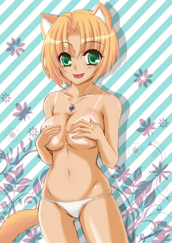 :p1girlanimal earsblonde hairbreastscovering breastscovering privatesfemale focusgreen eyesjewelrylarge breastsnecklaceshort hairsolotailtantanlinetonguetongue outtopless female