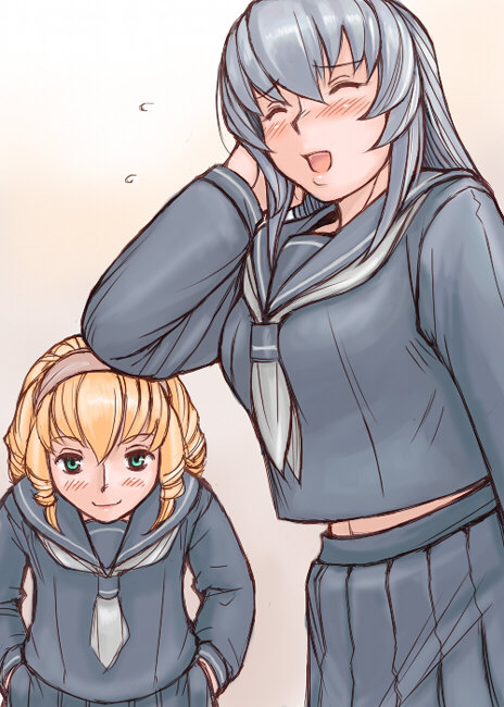 2girlsaged upblonde hairblushbreastsclosed eyescosplaygreen eyeslarge breastsmultiple girlsschool uniformserafuku