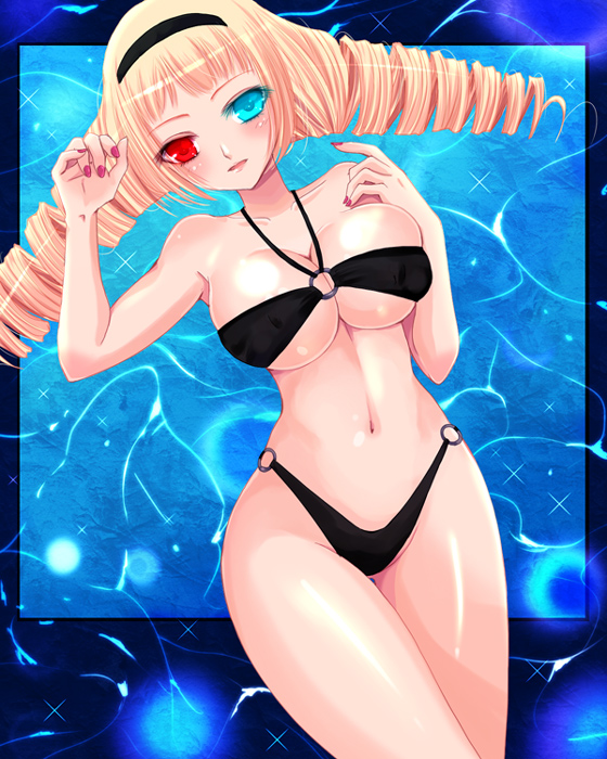 1girlbikiniblack bikiniblonde hairbreastsdrill hairfemale focushairbandheterochromiahighleghighleg bikinilarge breastslong hairnail polishnavelsoloswimsuit