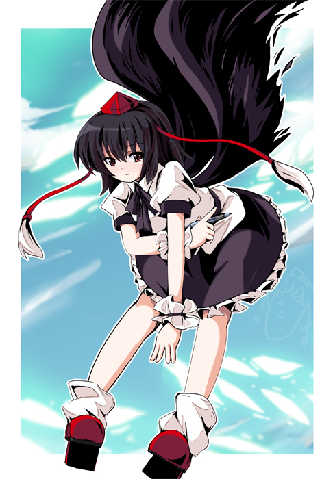1girlblack hairblack wingsexpressionlessfemale focusgetahatlooking at viewerpenred eyesshort hairsolotengu-getatokin hatwingswrist cuffs