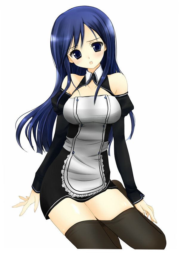 1girlblack pantyhoseblue eyesblue hairblushbreastsclothes pulldetached sleevesfemale focuslong hairmatching hair/eyesopen mouthpantyhosepantyhose pullsimple backgroundsolowhite background