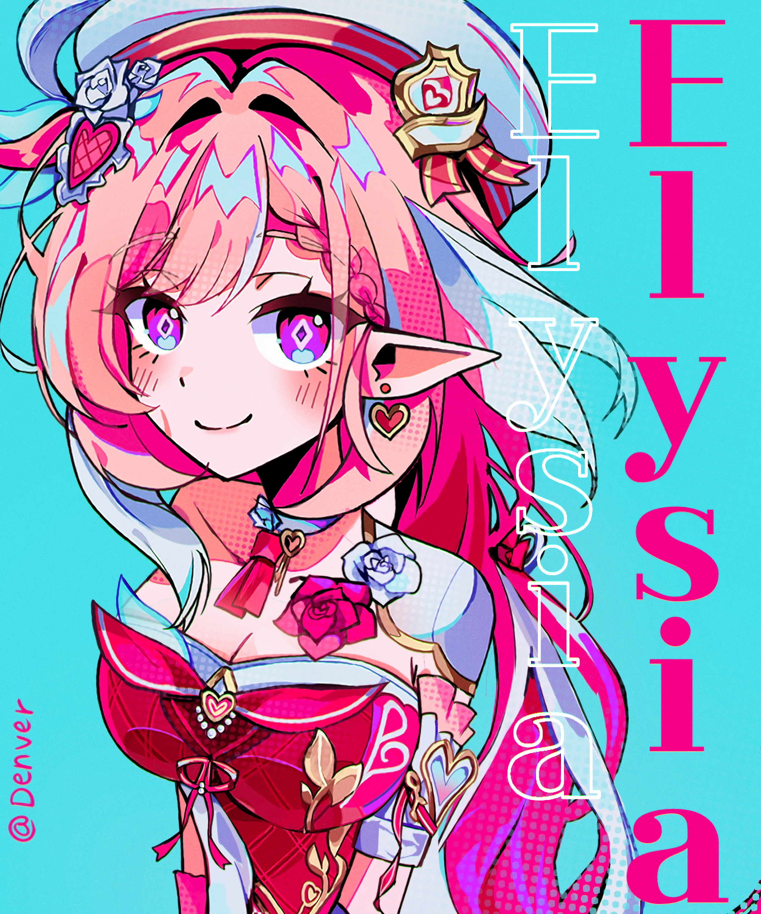 1girlberetblue backgroundbreastscharacter namecleavagediamond (shape)diamond-shaped pupilsdressearringselfhatheartheart earringsjewelrylarge breastslong hairlooking at viewermulticolored hairpink hairpointy earspurple eyesred dresssmilesolosymbol-shaped pupilstwitter usernametwo-tone hairuser hmff3223very long hairwhite hair