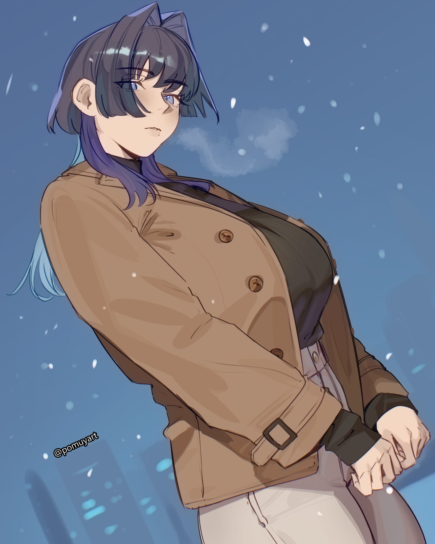 1girlalternate costumeblack hairblack shirtblue eyesblue hairblunt endsbreastsbrown jacketcolored inner hairhair intakeshuge breastsjacketlong hairlong sleeveslooking at viewermulticolored hairofficial alternate hairstyleoutdoorspantsshirtshirt tucked insnowsnowingsoloturtleneckvirtual youtuberwhite pantswolf cut