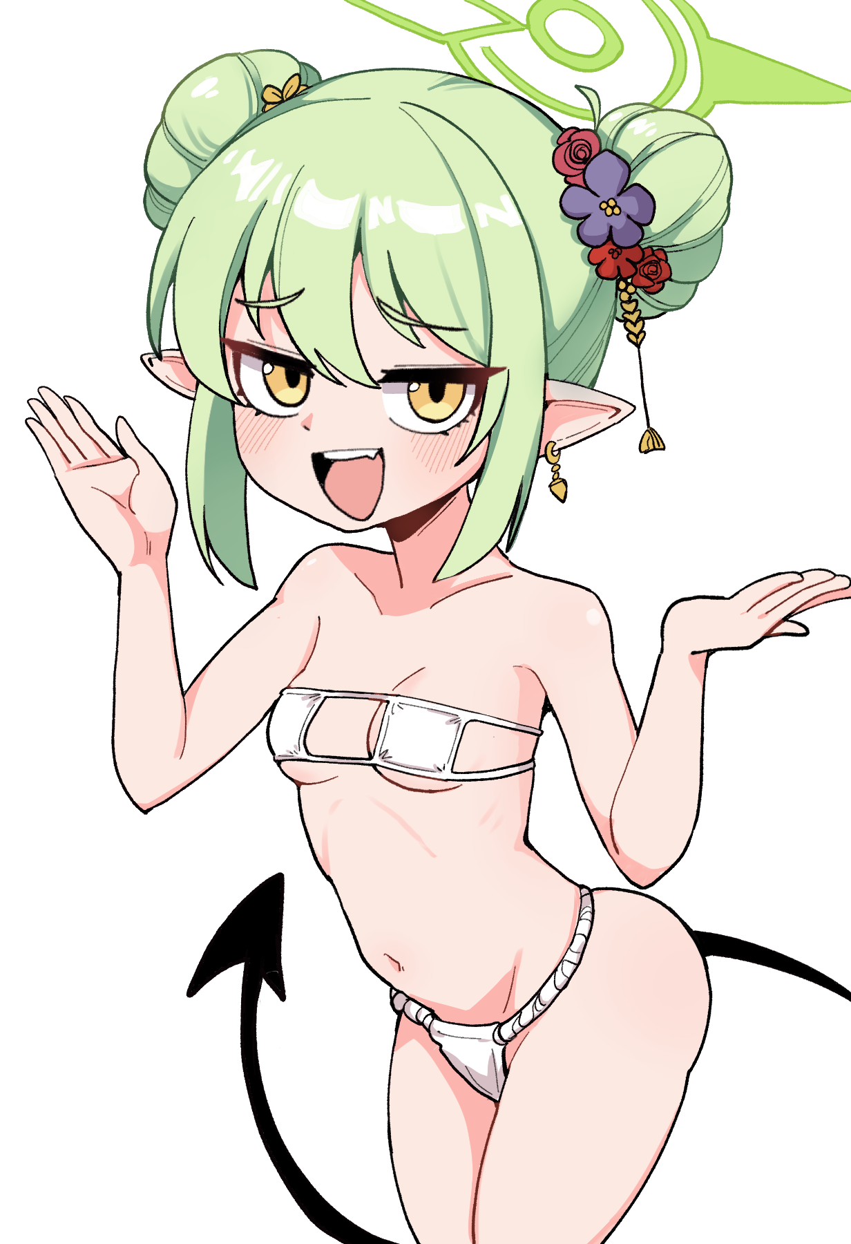 1girlbare armsbikinibreastsdemon hornsdouble bunearringseyepatch bikiniflowergreen hairgreen halohair bunhair flowerhair ornamenthalohornsjewelrylooking at viewernavelopen mouthpointy earssimple backgroundsmall breastssmilesoloswimsuitwhite backgroundwhite bikiniyellow eyes