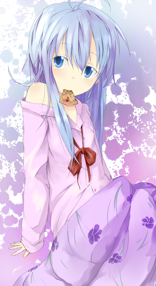 10s1girlantenna hairarm supportbare shouldersblue eyesblue haireatingfemale focusfoodlong hairmatching hair/eyespizzaribbonsolo