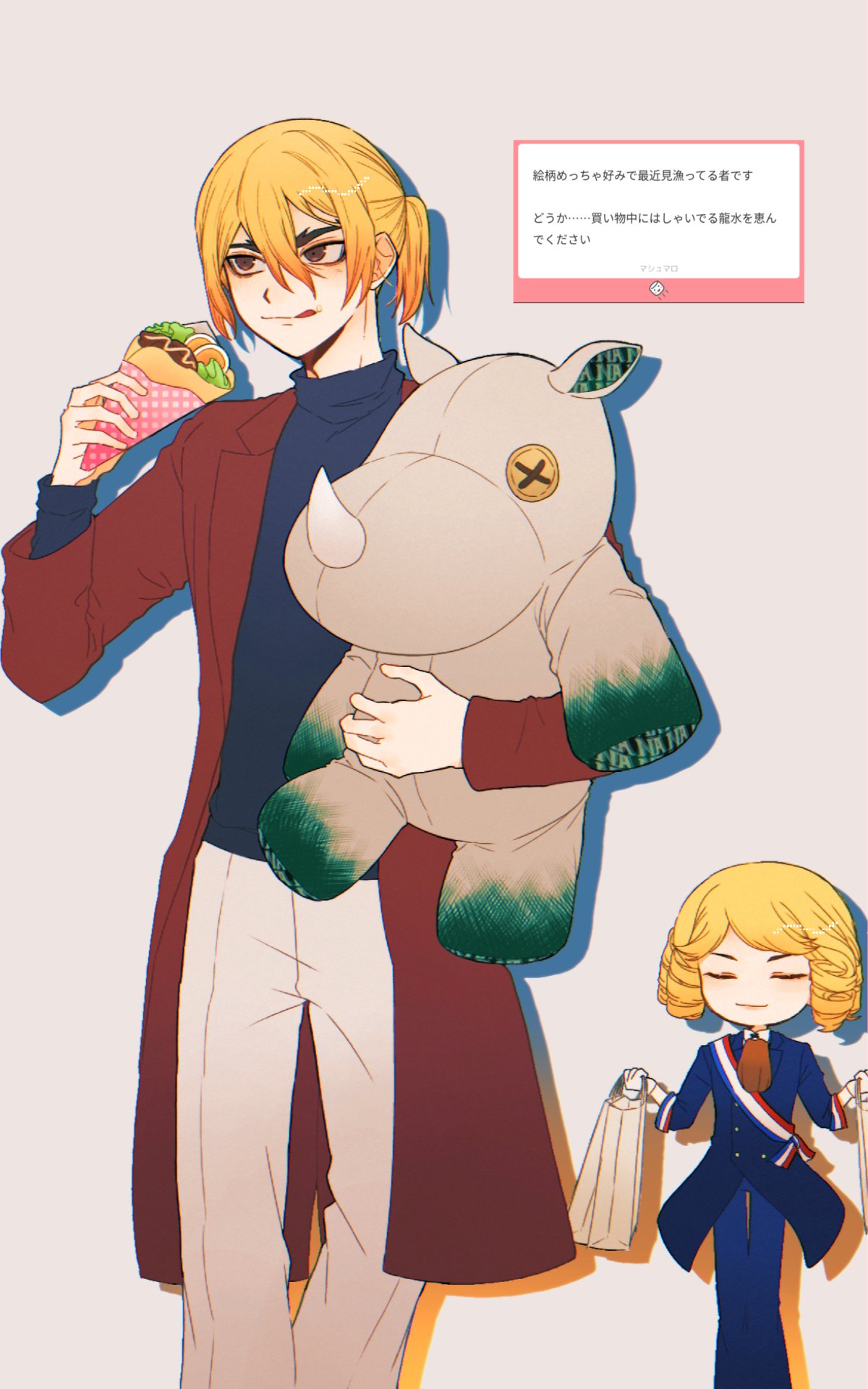 1boy1otherbagblack shirtblonde hairblue coatblue jacketblue pantsbrown eyesclosed eyesclosed mouthcoatcrepedrill hairfeet out of framefoodfrench flaggrey backgroundhair between eyeshippopotamusholdingholding foodholding stuffed toyjacketlong sleevesmale focuspantsponytailpxbyz6ynhc83433red coatshirtshort hairsimple backgroundsmilestuffed animalstuffed toytonguetongue out