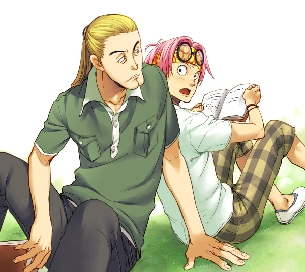 sumino takumi, tsukumo ima, the hundred line -last defense academy-, chinese commentary, commentary request, translation request, 2boys, ^^^, black hair, camille407, chinese text, closed eyes, grey background, grey jacket, hand on another's arm, hood, hood down, hug, hug from behind, jacket, long sleeves, male focus, medium hair, multicolored hair, multiple boys, open mouth, pink eyes, puff of air, purple hair, red hair, red jacket, short hair, simple background, smile, streaked hair, surprised, tsurime, two-tone hair