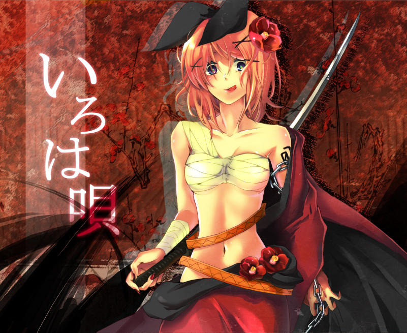 1girlblonde hairblue eyescamelliachainfemale focusflowerhair ornamenthair ribbonhairclipjapanese clotheskatanakimonoribbonsarashishort hairsmilesoloswordtongueweapon
