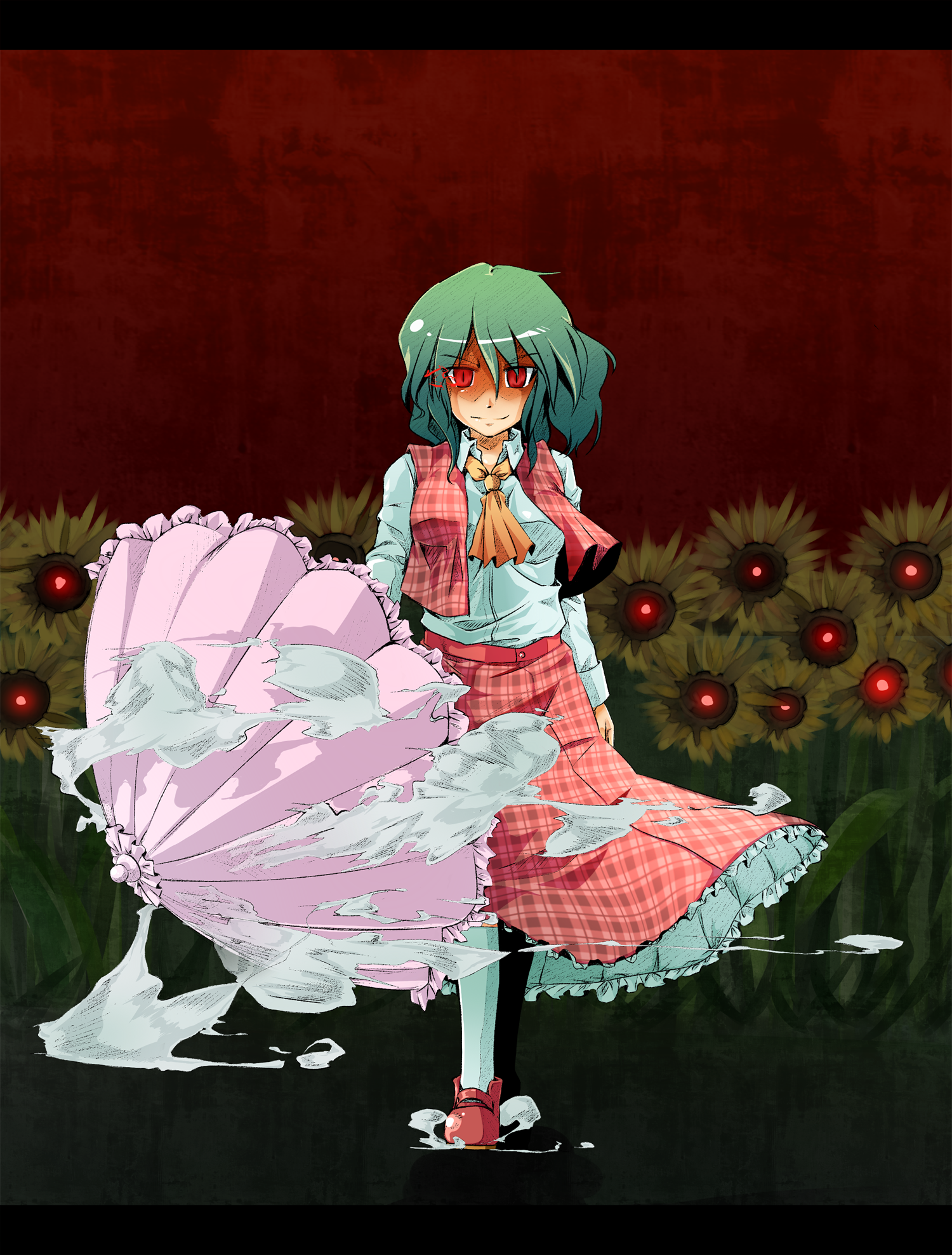 1girlascotfemale focusflowerglowingglowing eyesgreen hairletterboxedplaid clothesplaid skirtplaid vestred eyesshaded faceshort hairskirtskirt setsmirksolosunflowerumbrellavestwalking
