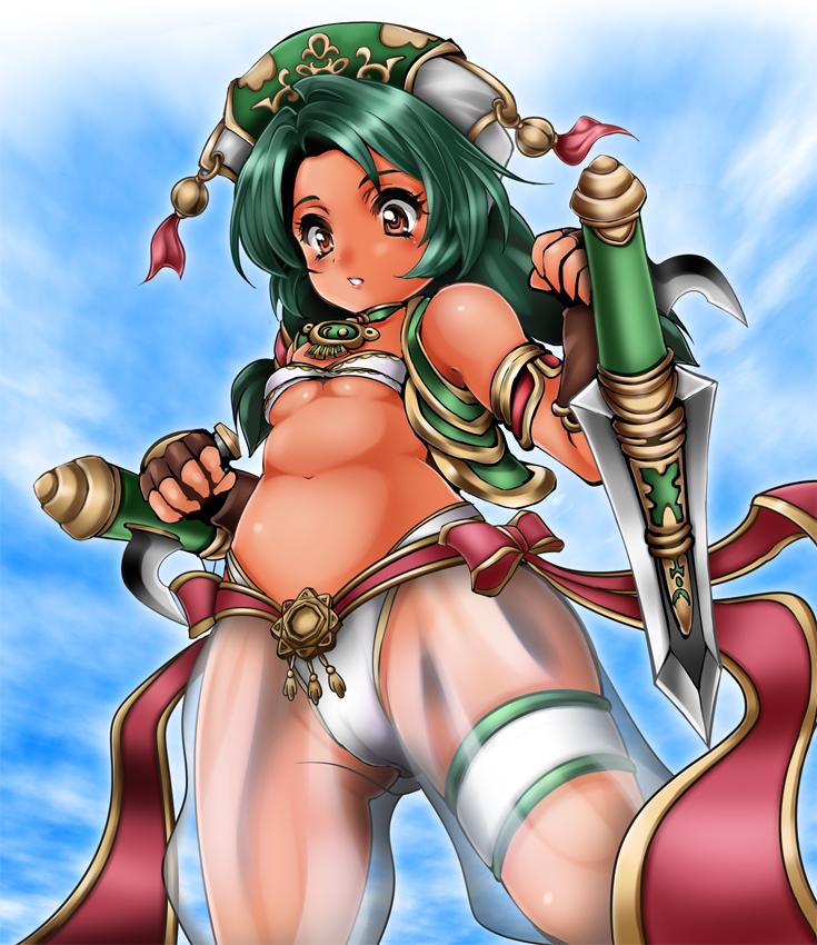 1girlbare shouldersbeltblushbowbraidbreastsbrown eyeschokerdark skindark-skinned femaledayfemale focusfingerless glovesflat chestfrom belowglovesgold trimgreen eyesgreen hairhatholdingholding weaponknifelong hairlooking downmatching hair/eyesnaveloutdoorspantiesrevealing clothesribbonsee-through clothesskysmall breastssoloswordtwin braidsunderboobunderwearweapon