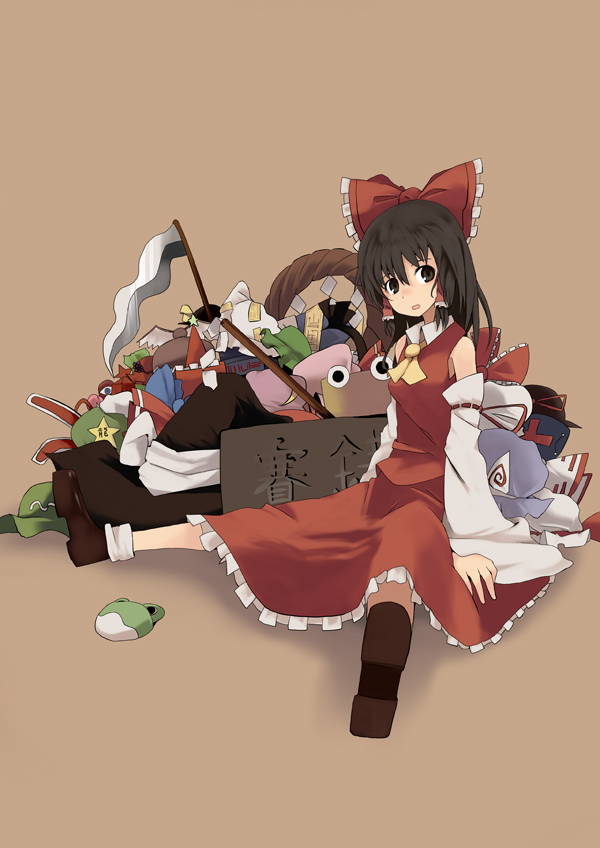 1girlblack eyesblack hairbowboxdetached sleevesfemale focusfull bodyhatjapanese clotheslong hairmikoribbonscytheshort hairsittingskirtsolo