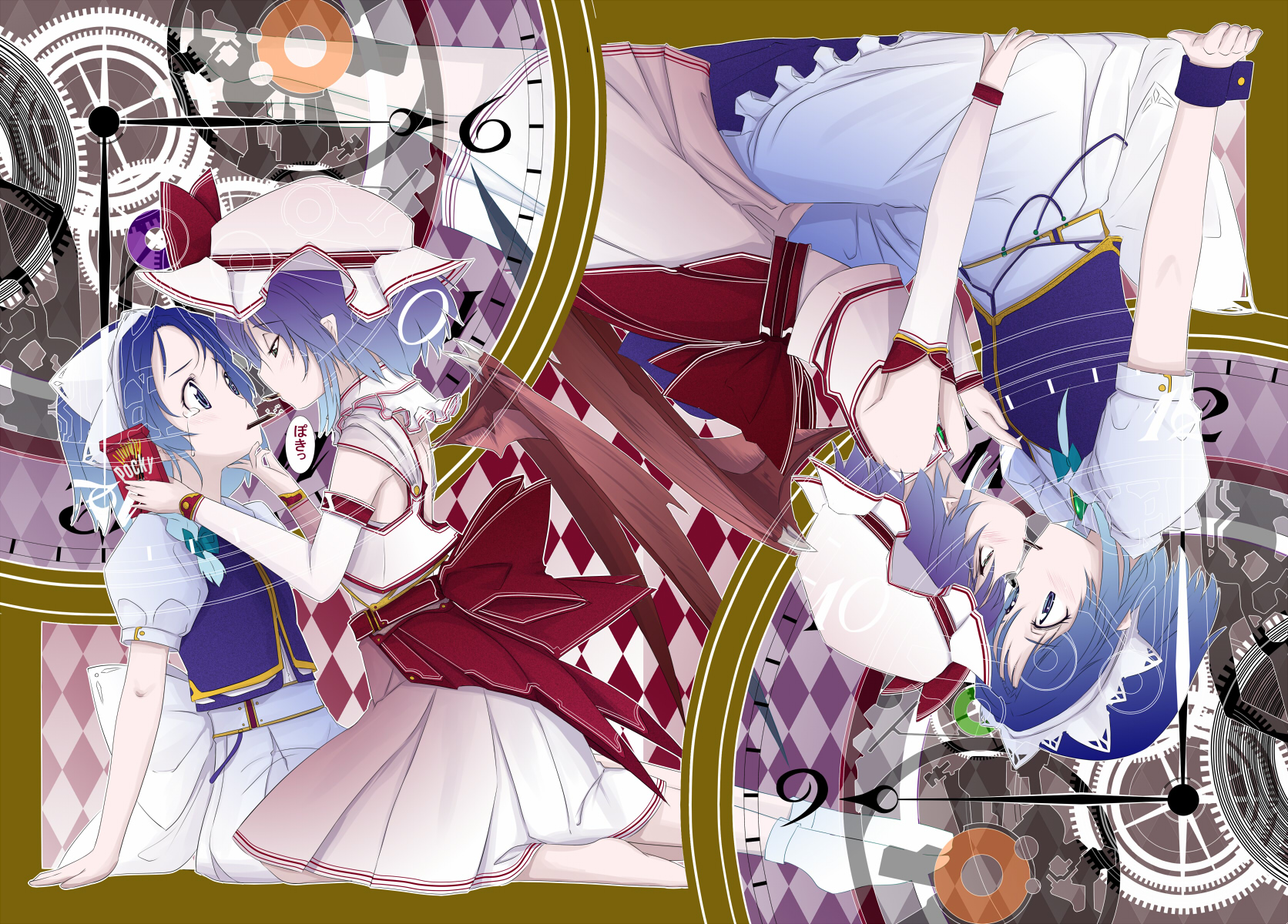 2girlsaged downbat wingsblue eyesblue hairblushbraidfemale focusfoodhairbandhatmouth holdmultiple girlspockypocky kissproduct placementshared foodshort hairsockstearswings