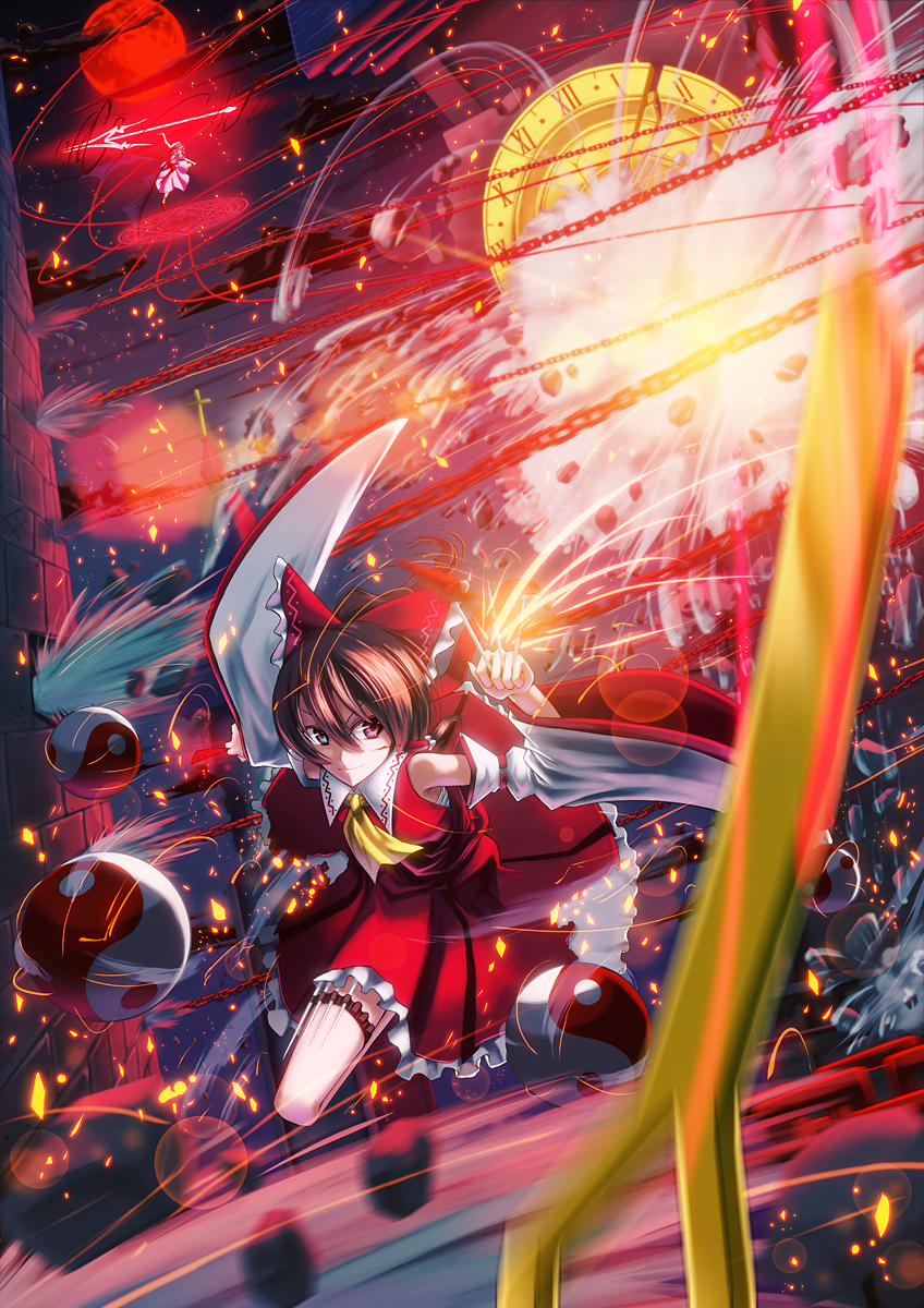 2girlsbat wingsbattlebowbrown hairchainclockclock towerdanmakudetached sleevesepicfemale focushair bowhatjapanese clothesmagic circlemikomoonmultiple girlsofudapolearmred eyesred moonroman numeralshort hairspearspear the gungnirtowerweaponwingsyin yang