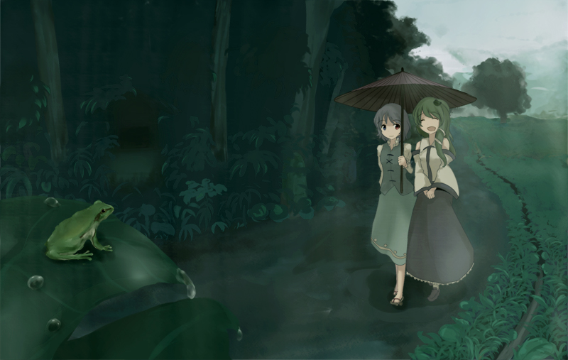 2girlscloudfemale focusfrogholdingholding umbrellamultiple girlsoutdoorsplantrainskytreeumbrellawalking