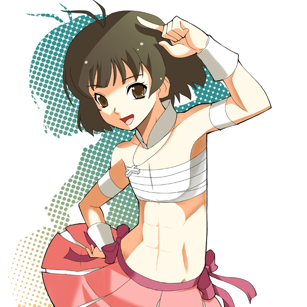 00s1boyabsantennaearmbandbandagesbowbrown eyeschest sarashicrosscrossdressingcrossdressing (mtf)cute & girly (idolmaster)jewelrymale focusmidriffmuscularnecklaceopen mouthribbonsarashismilesolotrapwrist cuffs