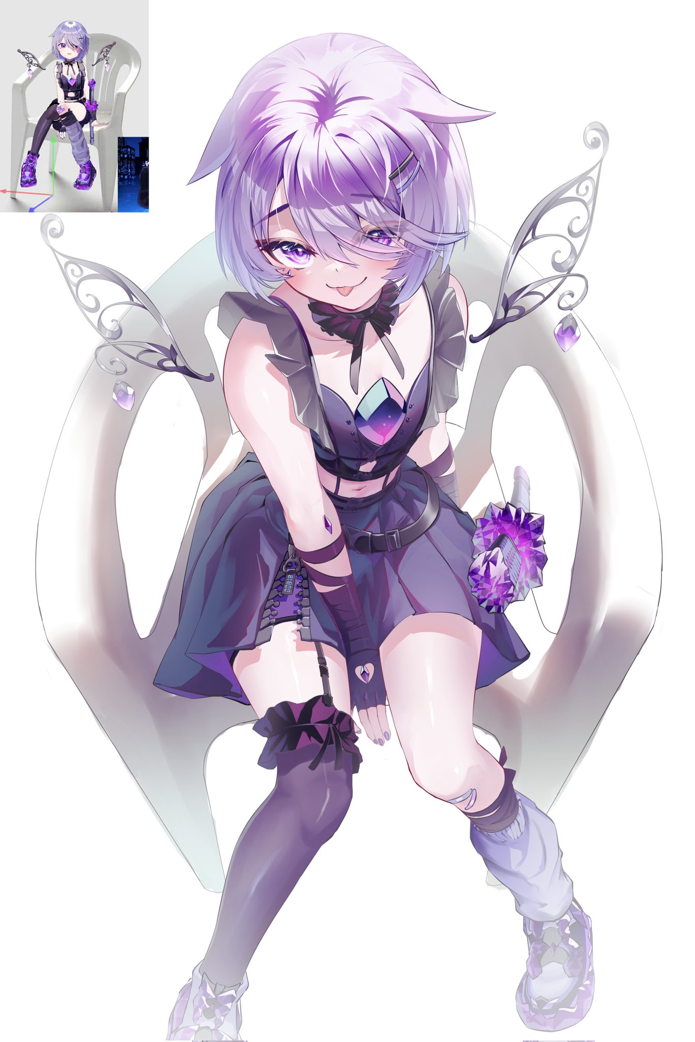 1girlbetween legschest jewelfingerless glovesfrom abovefull bodyfurrowed browgemgloveshair ornamenthaircliphand between legshand jeweljewel under eyeleg warmerslooking at viewermetal wingsmonobloc (chair)navelofficial alternate costumeofficial alternate hairstylepurple eyespurple gemstonepurple leg warmerspurple nailspurple thighhighsreference insetshort hairsimple backgroundsingle leg warmersingle thighhighsittingsolothighhighsthighstonguetongue outvirtual youtuberwhite background