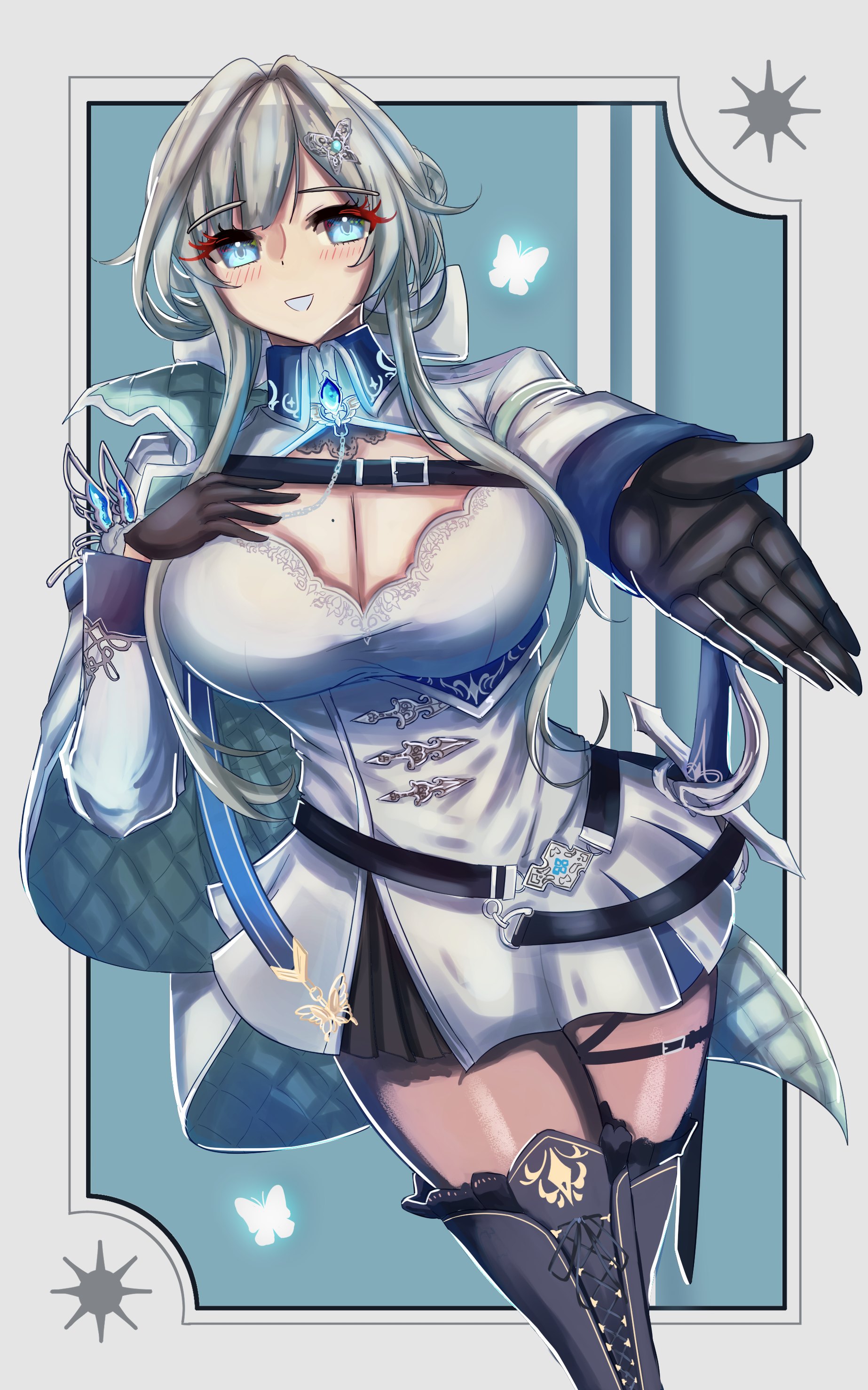 1girlblack bootsblack glovesblack skirtblue eyesbootsbreastsbutterfly hair ornamentcleavagedressfukoudaglovesgrey hairhair ornamenthand on own chestlace-up bootslarge breastsmolemole on breastpantyhosepleated skirtreachingreaching towards viewerskirtsmilesoloswordthigh bootsvirtual youtuberweaponwhite dress