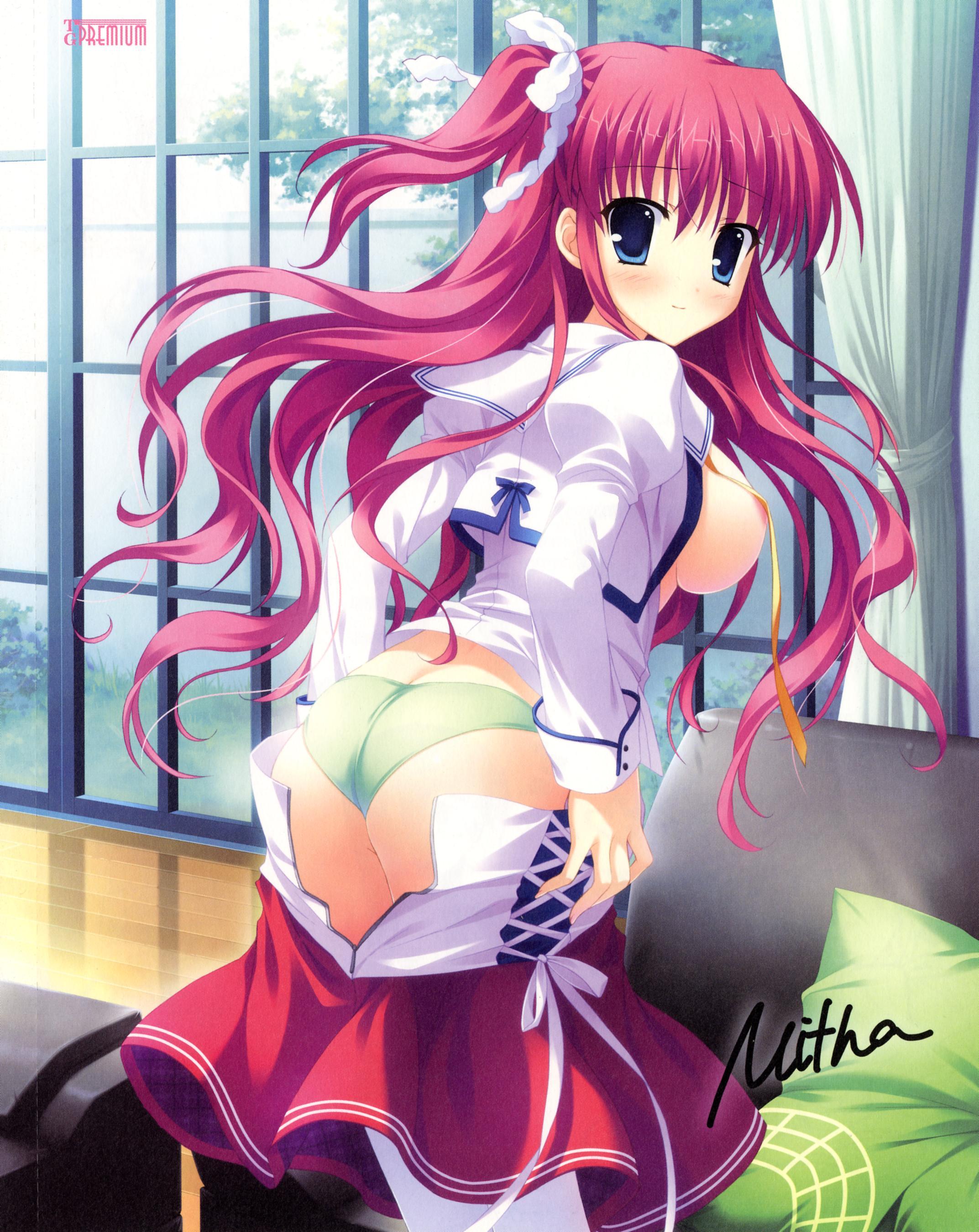 1girlassblue eyesblushbreastsclothes pullfemale focusfingernailsgreen pantieslarge breastslong hairlooking backnail (hardware)open clothesopen shirtpantiespink hairschool uniformshirtshort twintailssideboobskirtskirt pullsolotwintailstwo side upunderwearundressing