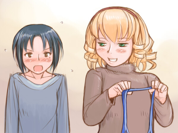 00s2girlsaged upblack hairblonde hairblushbrown eyescasualgreen eyesgrinhairbandmolemole under eyemultiple girlsringletsshort hairslingshot swimsuitsmileswimsuit