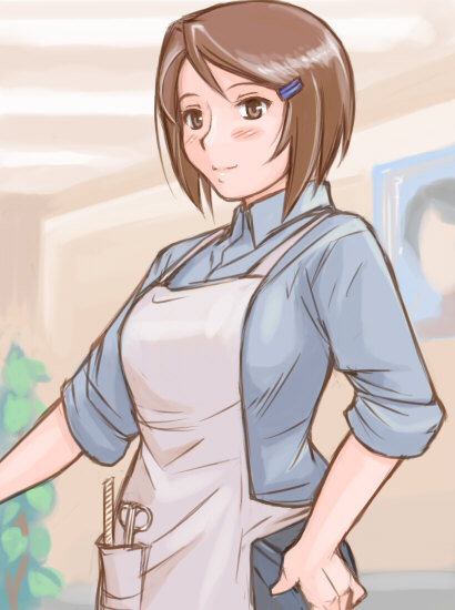 00s1girlaged upapronblushbrown eyesbrown haircasualfemale focushair ornamenthaircliphand on own hiphip focusindoorsscissorsshort hairsleeves rolled upsolo