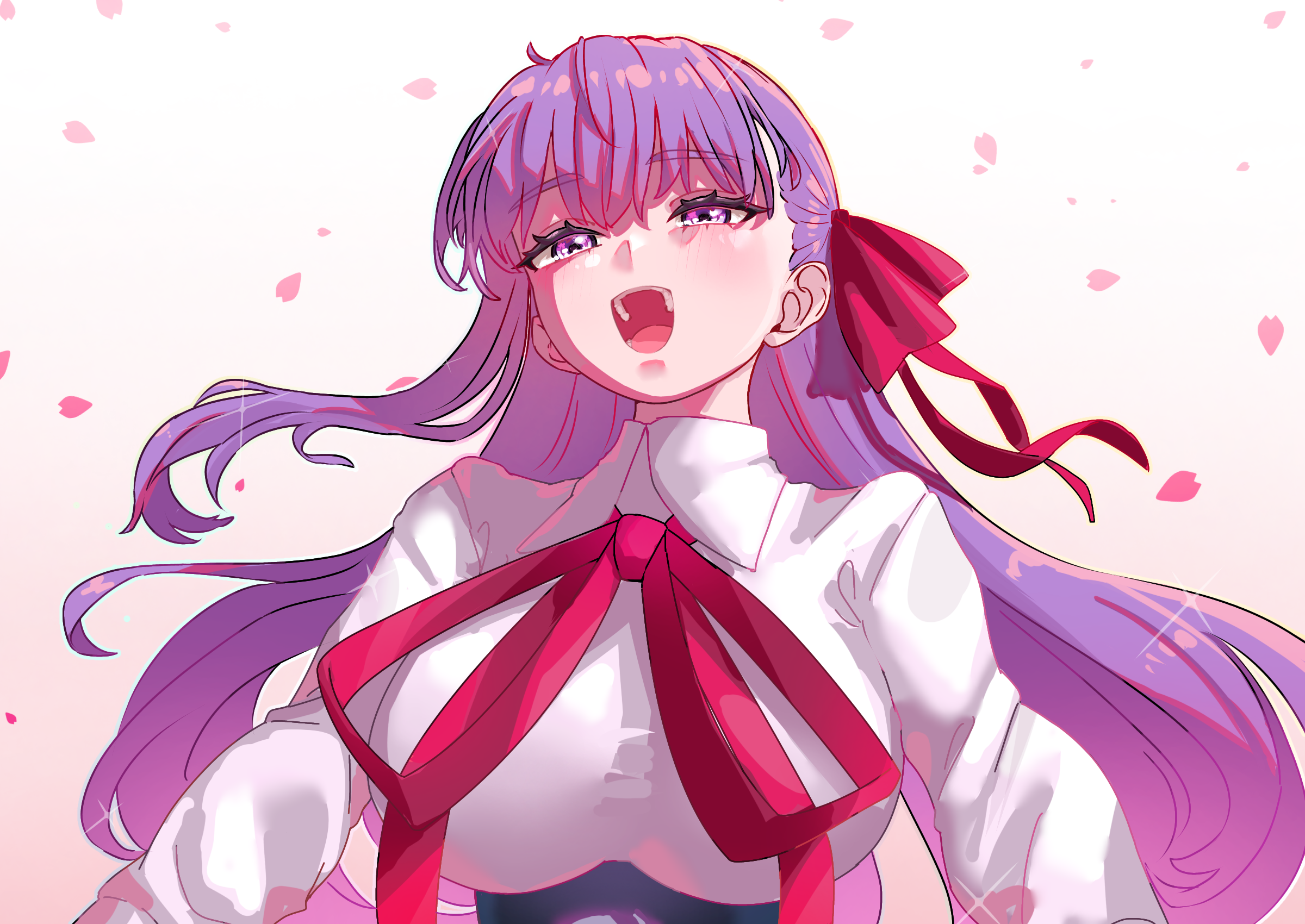 1girlblushbreastshair ribbonlarge breastslong hairlong sleeveslooking at vieweropen mouthpurple eyespurple hairred ribbonribbonskirtsmilesolovery long hair