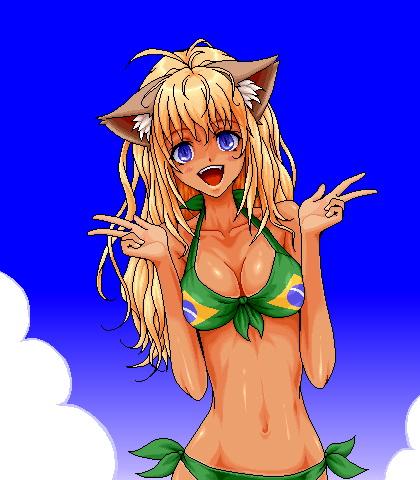 1girlanimal earsbikiniblonde hairblue eyesbrazilbreastscat earscleavagefemale focusfront-tie topgreen bikinilong hairside-tie bikini bottomsoloswimsuittanv