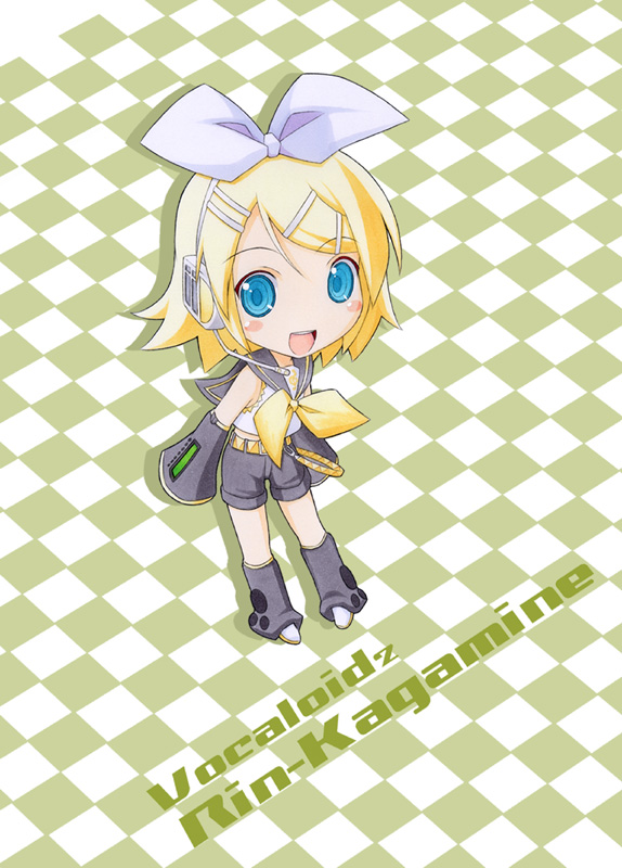 :d1girlarm warmersbeltblack shortsblonde hairblouseblue eyesblushblush stickersbowcharacter namecheckered backgroundcheckered floorchibicopyright namefemale focusfrom abovefull bodyhair bowhair ornamenthairclipheadphonesleg warmerslegs apartmicrophoneopen mouthribbonsailor collarshirtshort hairshortssleevelesssmilesolostandingswept bangswhite bowwhite shirtyellow ribbon