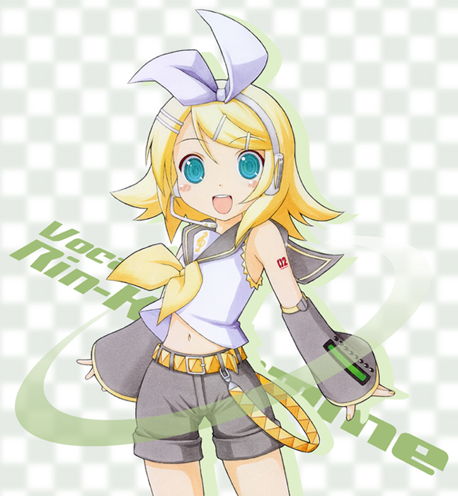 1girlaqua eyesbare shouldersbeltblonde hairblushbowdetached sleevesflat chestheadsetlooking at viewernavelopen mouthshort hairshortssleeves past wristssmile