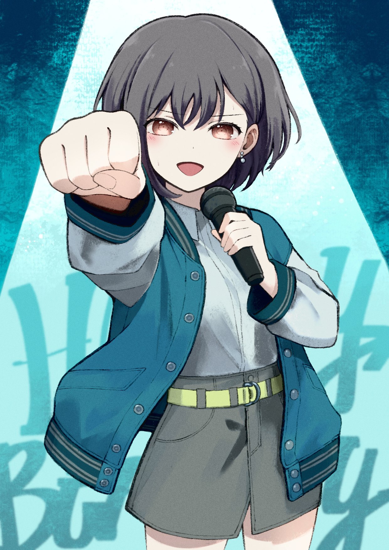1girlbrown eyesbrown hairclenched handgrey hairhappy birthdaylong sleeveslooking at viewermicrophoneninoyamaopen mouthshort hairsmilesolo