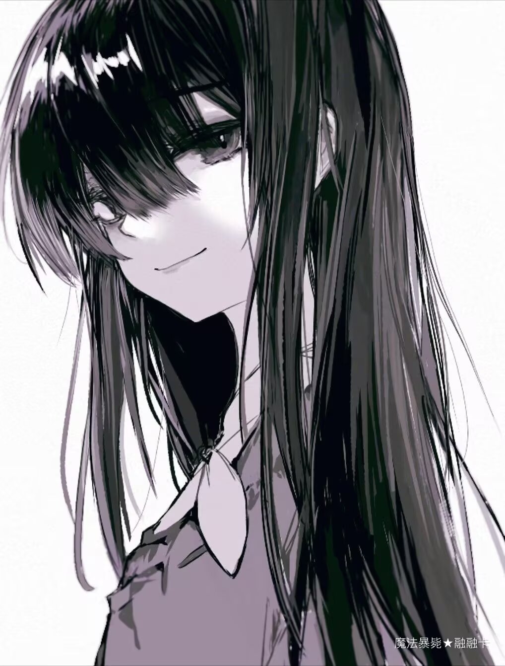 1girlcenter-flap bangschinese textclosed mouthdouble-parted bangsgreyscalehair between eyeslong hairlooking at viewermellocaamonochromeneckerchiefportraitshirtsimple backgroundsmilesolostar (symbol)straight hairsweaterwhite background