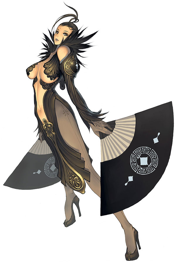black hairbreastschina dresschinese clothescleavagehand fanhigh heelsmidriffnavelpantyhoseshoesthighhighsunderboob