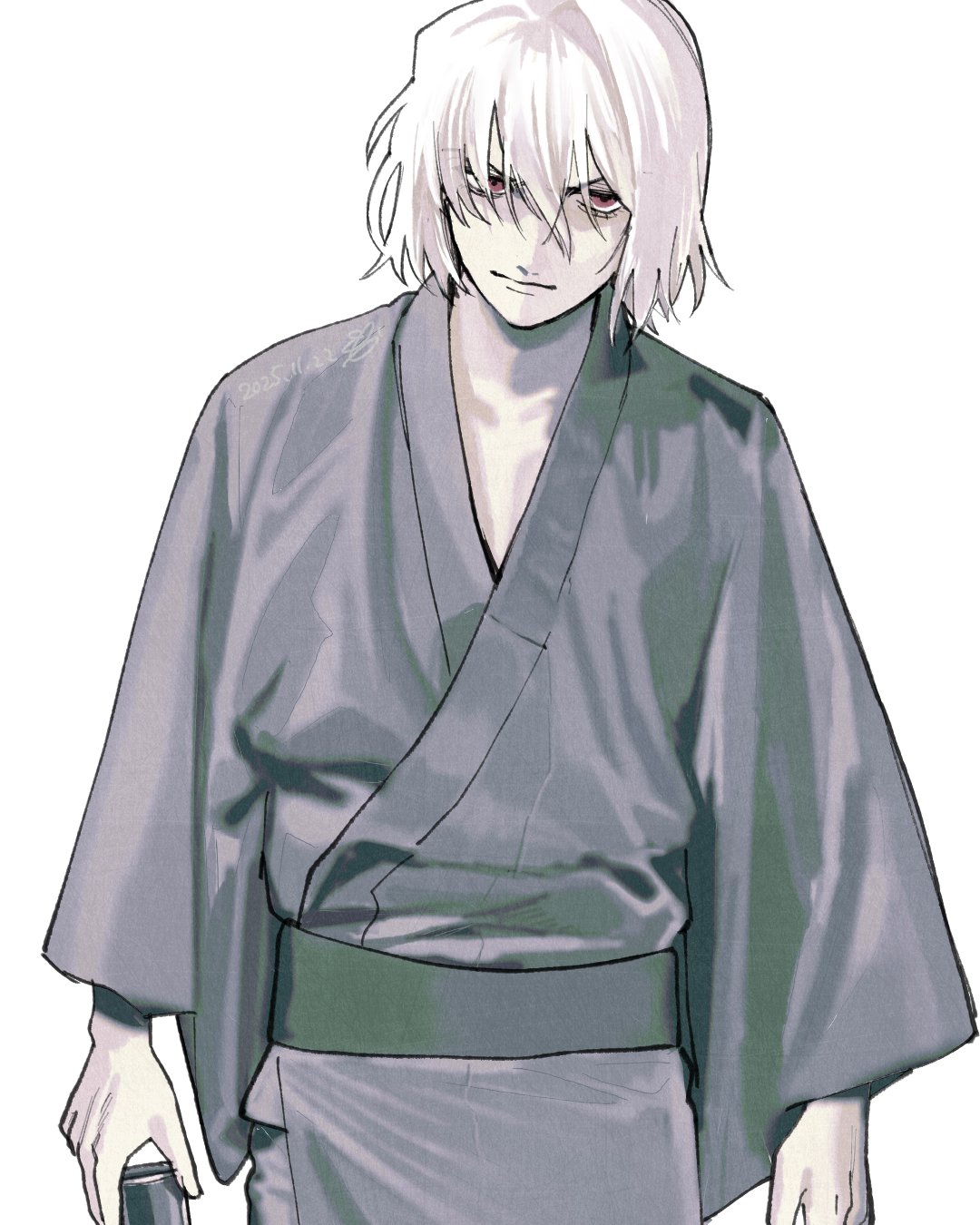 1boyangryblue kimonocancanned coffeedrink canhair between eyesholdingholding canjapanese clotheskimonolooking at viewermale focusmedium hairpartially shaded facered eyesstandingwavy hairwhite background