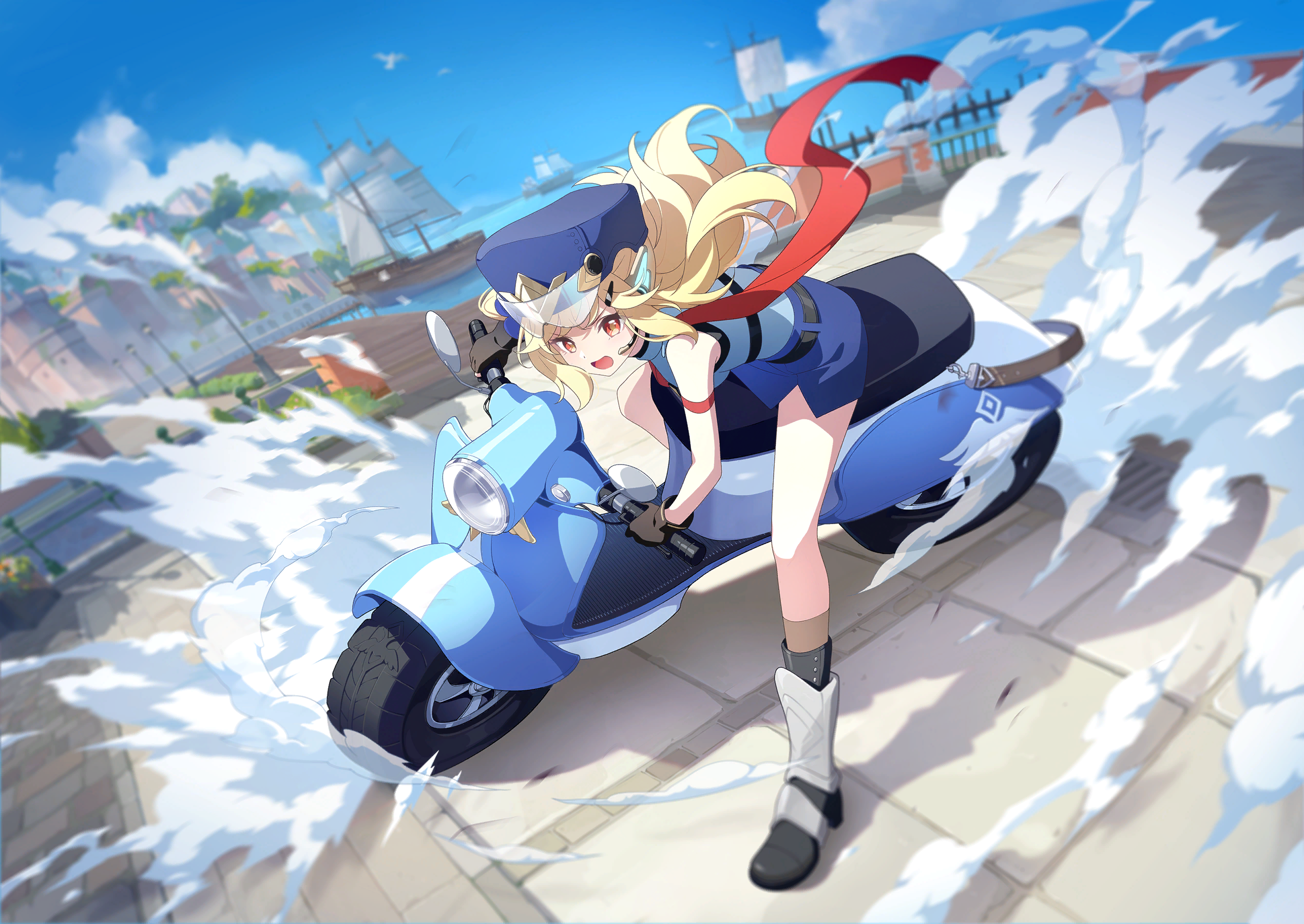 :d1girlarmored bootsbare shouldersblack bootsblack glovesblonde hairblue hatblue skirtbootsfull bodygloveshatheadsetlong hairlooking at viewerminiskirtmotor vehicleon scooteropen mouthorange eyesoutdoorsscooterside ponytailside slitskirtsmilesolov-shaped eyebrows