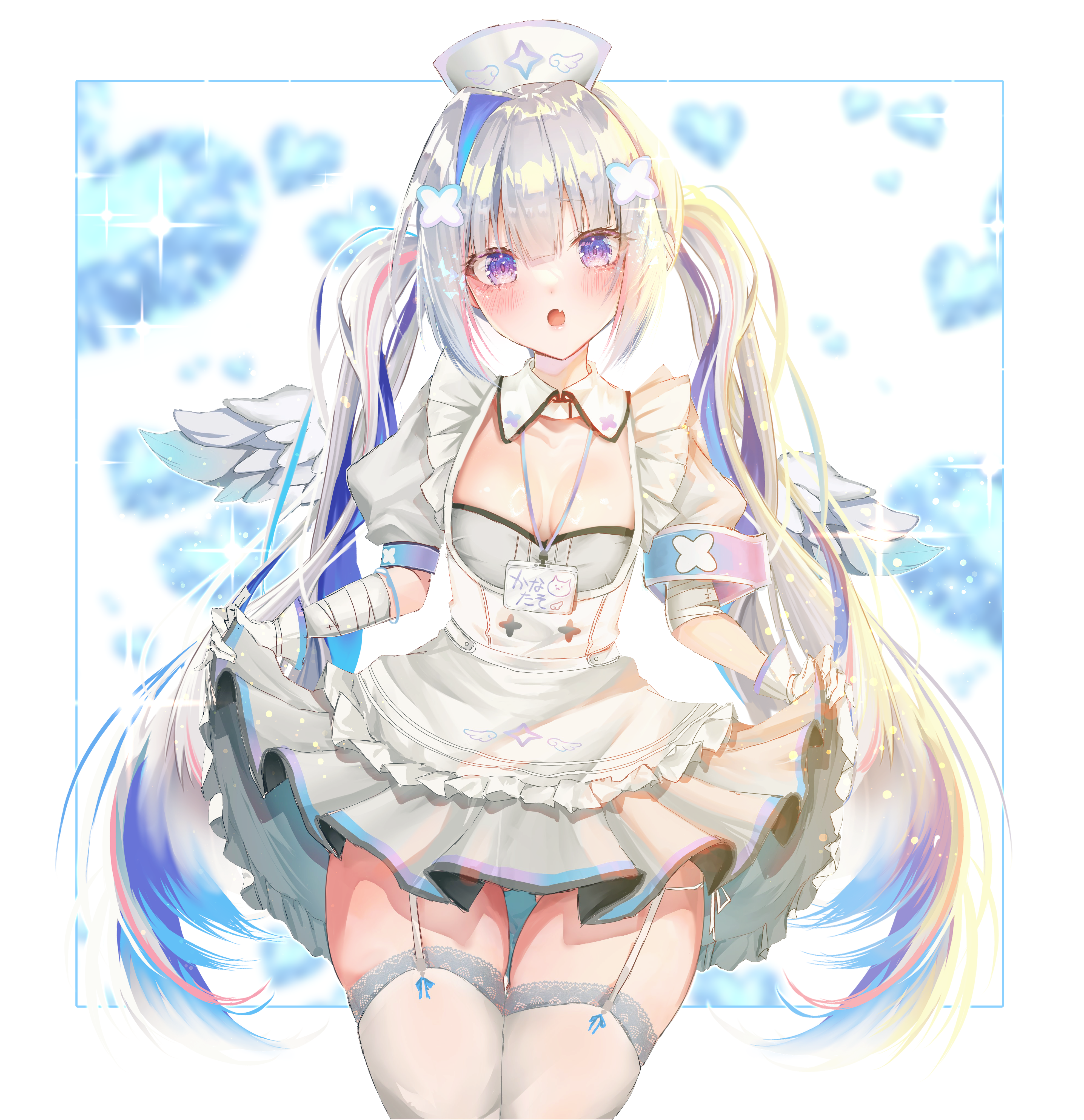 1girlangelangel wingsbandaged armbandagesblue hairblushbreastsclothes liftcolored inner hairdetached collardressfangfeathered wingsgarter strapsgemglovesgluteal foldgradient hairgrey hairhair ornamenthatid cardlacelace trimlace-trimmed thighhighslanyardlifting own clotheslong hairlooking at viewermini wingsmulticolored hairnursenurse capofficial alternate hair lengthofficial alternate hairstyleopen mouthpantiespetitepurple eyesside-tie pantiesskirtskirt liftsmall breastssolostreaked hairthighhighsthighstwintailsunderwearvirtual youtuberwhite backgroundwhite gloveswing collarwingsx hair ornament