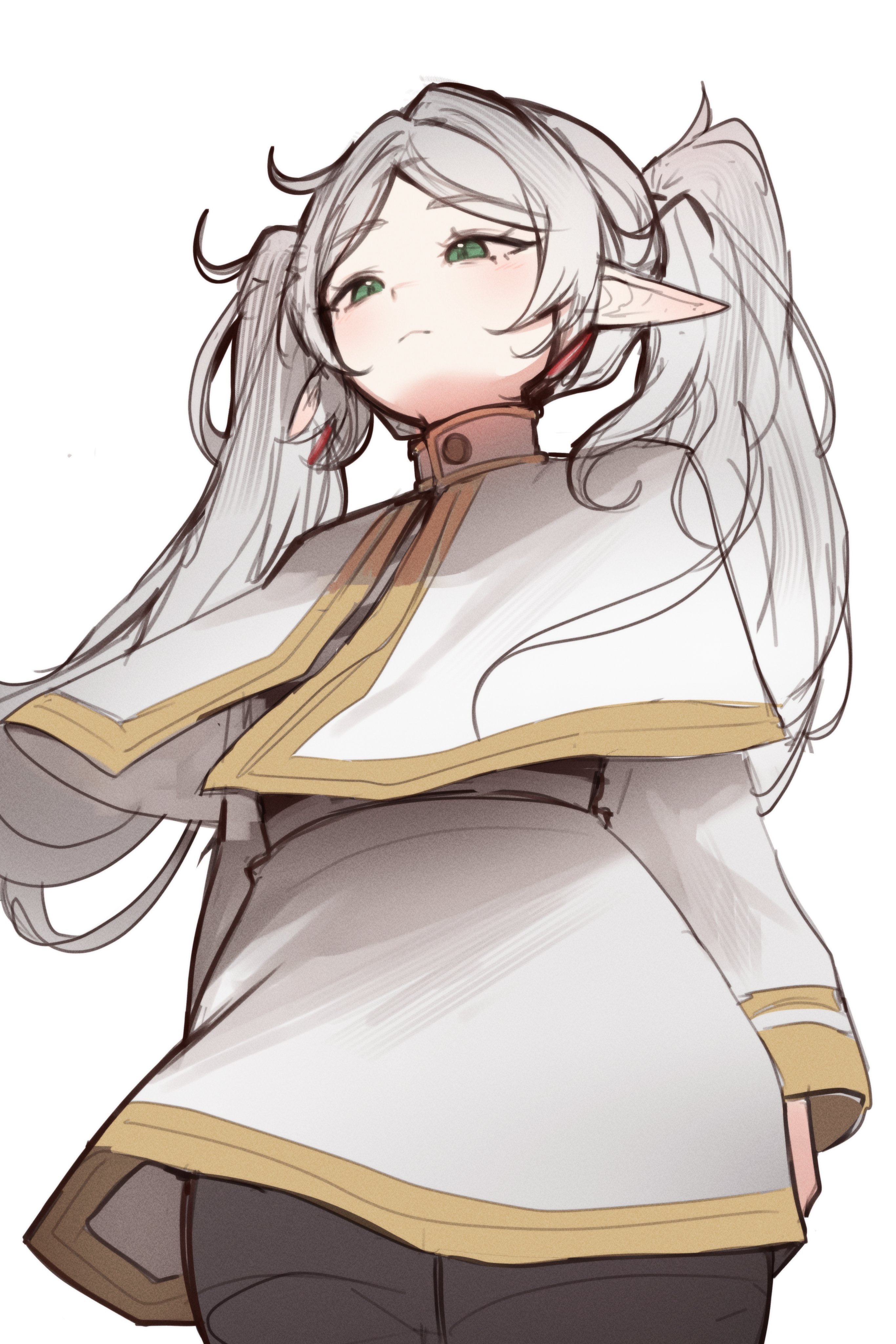 1girlblack leggingscapeletclosed mouthearringselffrom belowgreen eyesjewelryleggingslong hairlong sleevesmemepointy earsshirtsimple backgroundskirtsolostriped clothesstriped shirttwintailstwo-tone shirtupward angle frieren drawing (meme)white backgroundwhite capeletwhite hairwhite shirtwhite skirtwind