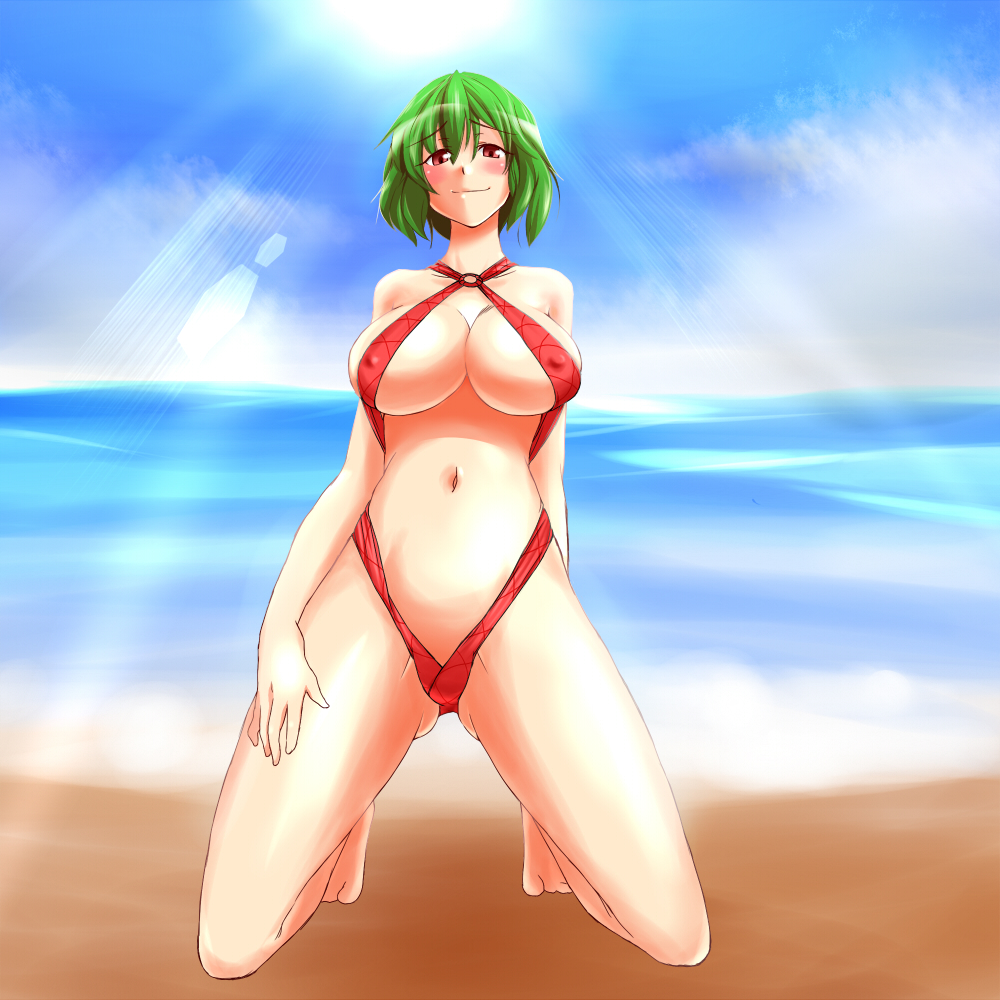 1girlbad feetbarefootbeachblushbreastscloudcovered erect nipplescriss crossed topcriss-cross halterdayembarrassedfeetfemale focusfull bodygreen hairhalterneckhuge breastskneelingoceanoutdoorspretzel bikinired eyesshort hairsideboobskysmilesmugsolosunswimsuitthighsunderboobwater