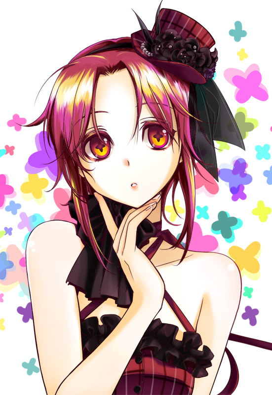 1boy1girlbare shouldersbowdressfemale focusgothic lolitagradient hairhand on own chinhatlolita fashionmini hatmini top hatmulticolored eyesmulticolored hairparted lipspink hairred hairsolosymbol-shaped pupilstop hatupper bodyyellow eyes