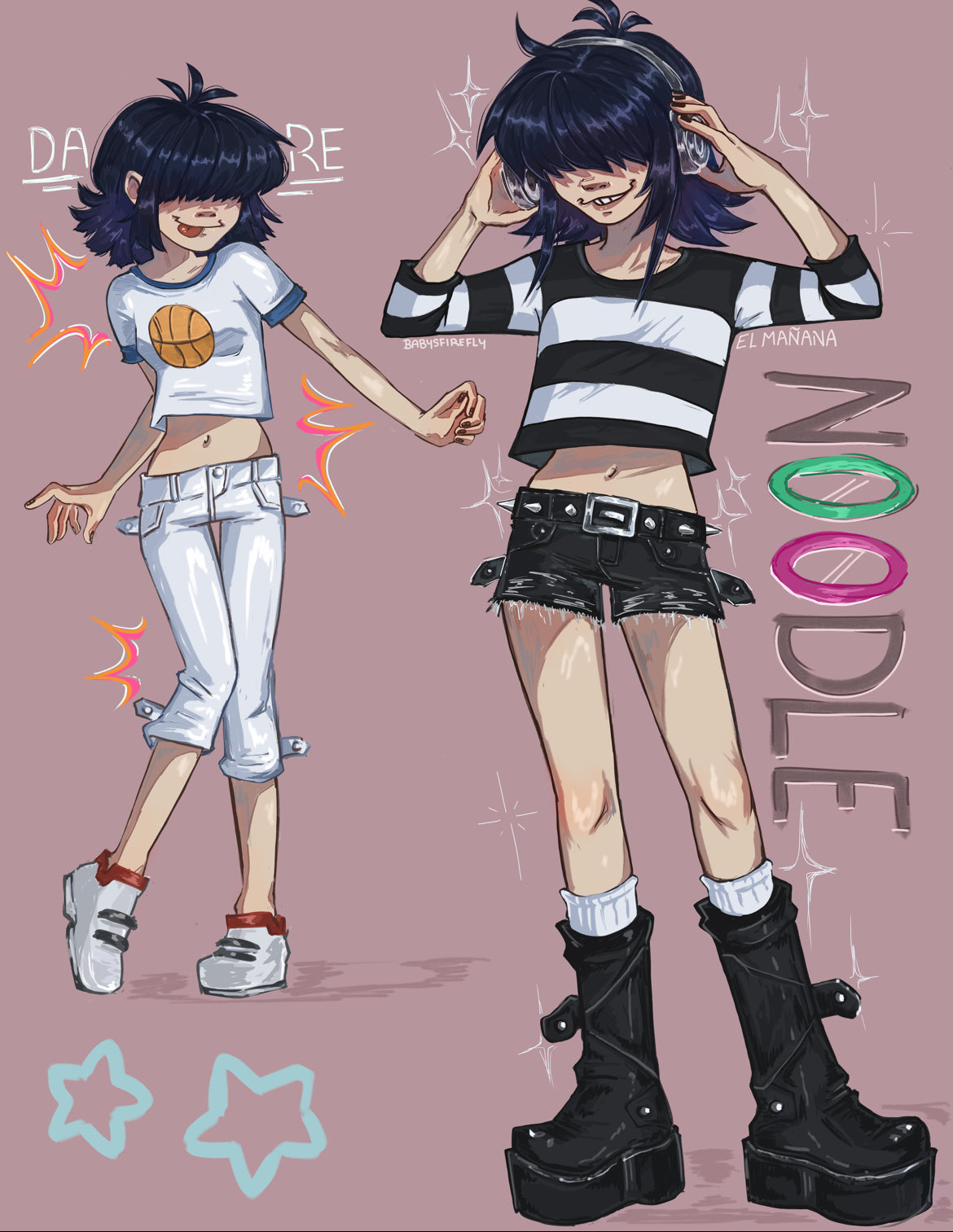 narita imomushi, commentary request, 1boy, 1girl, abs, armband, arms behind head, belt, belt buckle, black hood, black shirt, black shorts, black sleeves, blood, blue eyes, breasts, brown belt, buckle, cape, cleavage, closed mouth, coffin, crossed legs, crystal, crystal horns, detached sleeves, feet, full body, gloves, hair between eyes, hand up, heterochromia, horns, in container, killing me/killing you, legwear garter, long sleeves, lying, medium breasts, medium hair, meteor (killing me/killing you), miniskirt, multiple boys, mutation, navel, on back, orange eyes, pillarboxed, pink hair, red bandage, sandals, shirt, shorts, single horn, skirt, sleeveless, sleeveless shirt, sleeves past wrists, thighhighs, thighs, white cape, white skirt, yellow gloves, youthanasia (killing me/killing you), zettai ryouiki, zipper, zipper pull tab