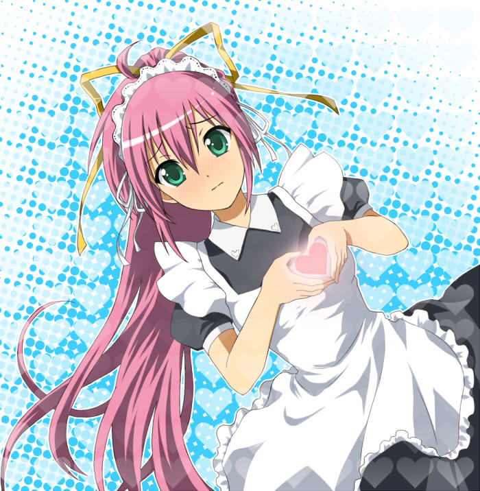 1girlalternate costumeblushdutch angleenmaidedfemale focusgreen eyesheartheart handslong hairmaidmoe moe kyun!parodypink hairponytailsolo