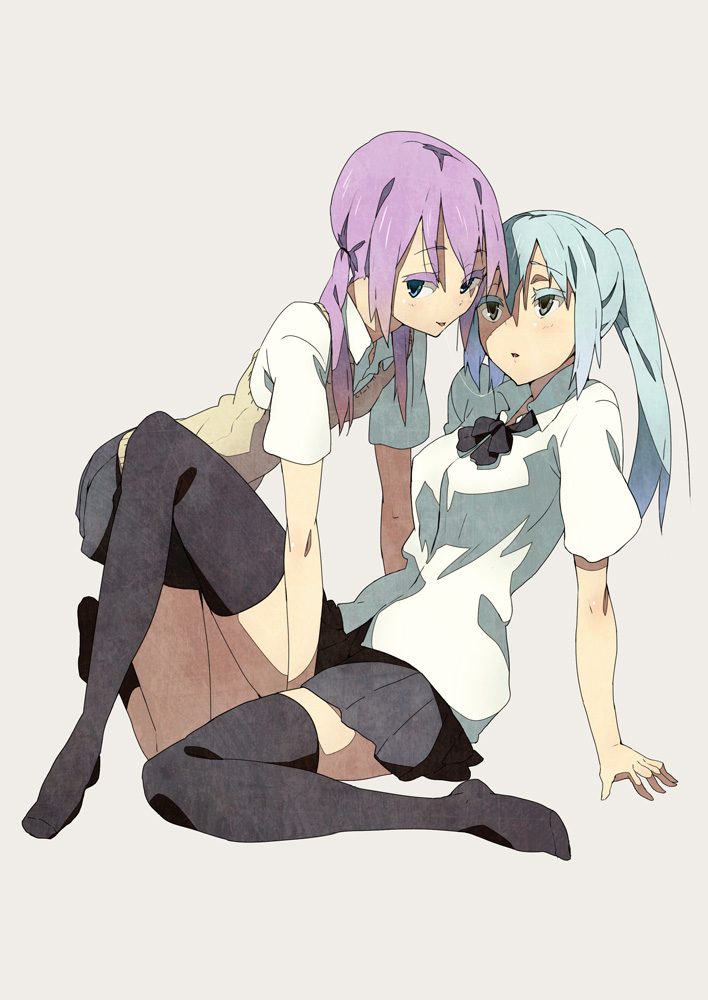 2girlsafter kissblack thighhighsblue haircolored eyelasheseyelasheslong hairmultiple girlsponytailpurple hairsalivasaliva trailschool uniformskirtthighhighstwintailsyuri