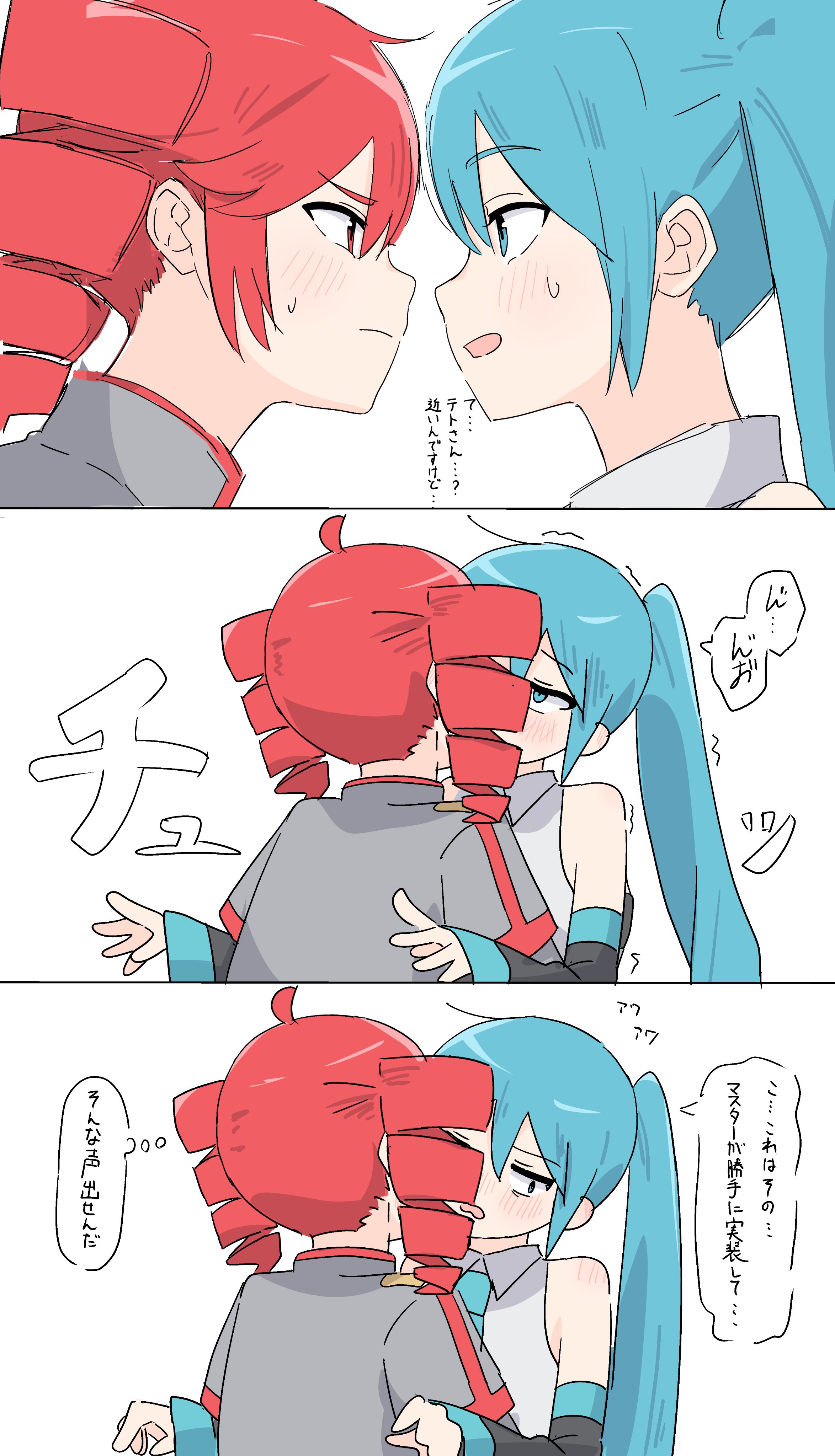 2girlsblue eyesblue hairblue necktieblushcollared shirtdetached sleevesdrill haireye contactgrey shirtkisslooking at anothermultiple girlsnecktiered eyesred hairshirtsimple backgroundsleevelesssleeveless shirtspeech bubblethought bubbletwin drillstwintailswhite backgroundwhite shirtyuri