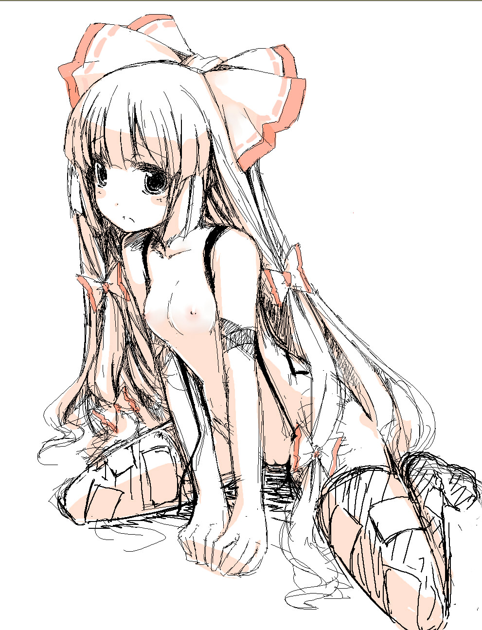 1girlbowbreastsfemale focushair bowlong hairmultiple hair bowsnipplesnudepussyribbonsittingsketchsmall breastssolosuspendersthighhighsvery long hair