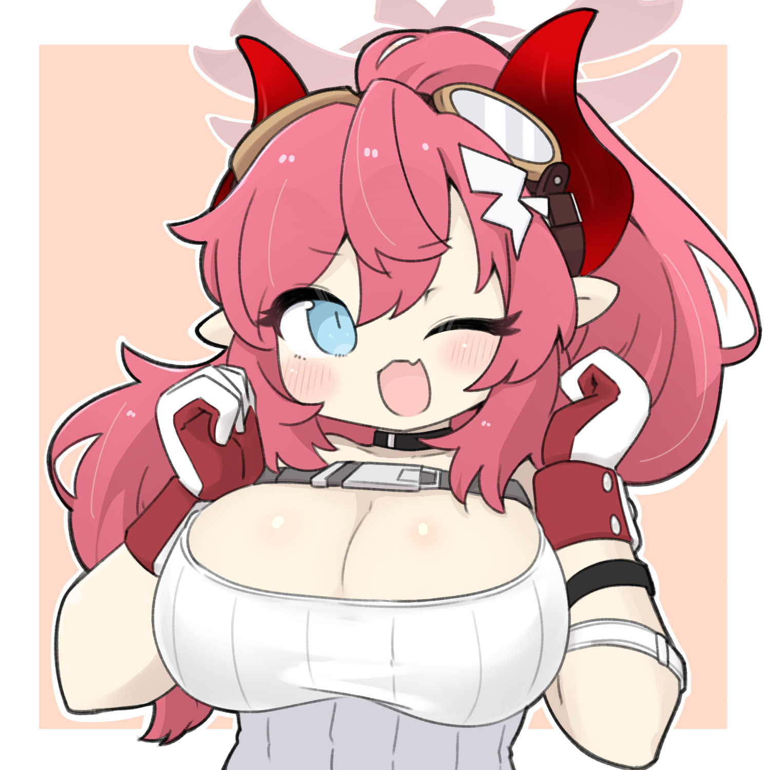 :d1girlbare shouldersblue eyesblushborderbreastsbrown backgroundchibicleavagecollarbonedemon hornsglovesgogglesgoggles on headhair between eyeshalohands uphornslarge breastslong hairlooking at viewerone eye closedopen mouthpink hairponytailsmilesolotank topupper bodyvery long hairwhite borderwhite gloveswhite tank top