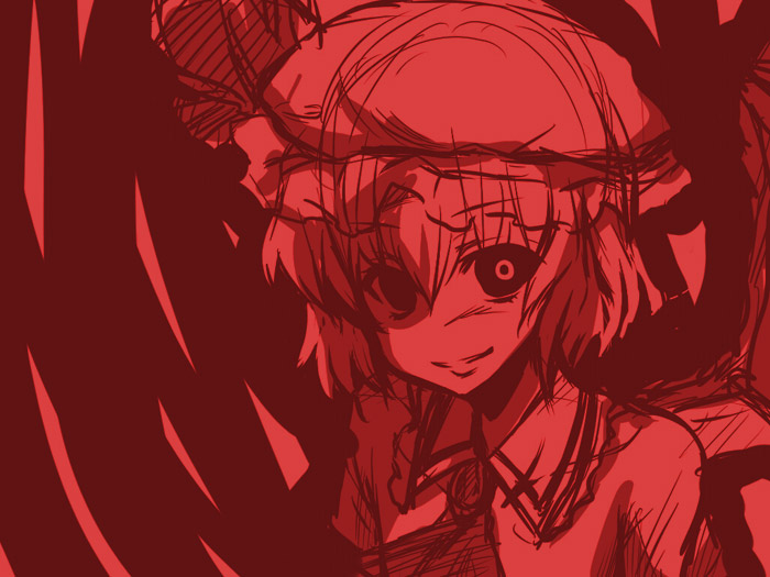 1girlbat wingsblack sclerabroochcolored sclerafemale focusglowingglowing eyehatjewelrymismatched scleramonochromered themesketchsmilesolowings