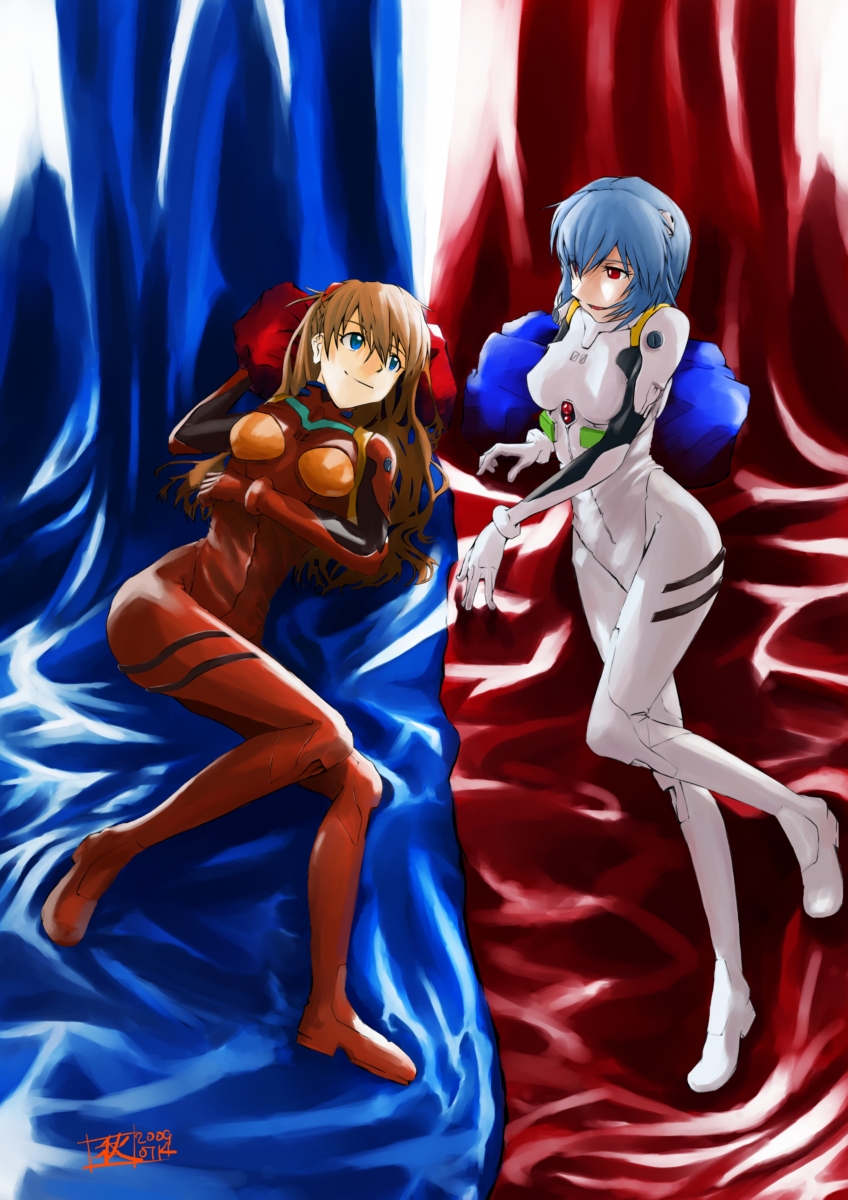 2girlsblue eyesblue hairbrown hairlong hairlyingmecha pilot suitmultiple girlson sidepillowplugsuit (evangelion)red eyesshort hair
